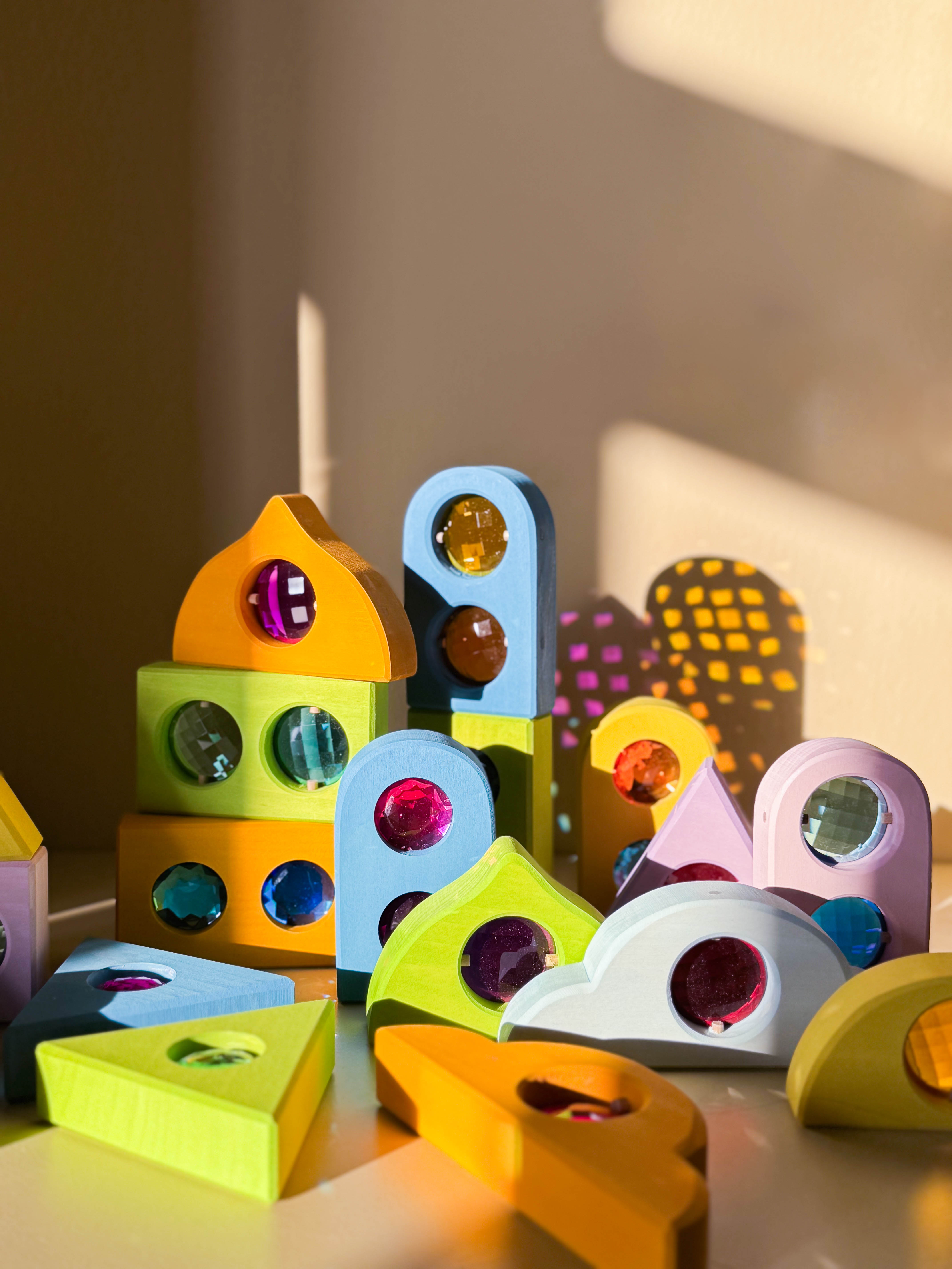 Das Set enthält sechs unterschiedliche geometrische Fensterformen, jeweils zweifach ausgeführt. Die transparenten Steine glitzern im Sonnenlicht, werfen ein besonderes Farb- und Lichtspiel in den Raum und laden Kinder dazu ein, durch die Fenster zu schauen und immer neue Perspektiven zu entdecken.