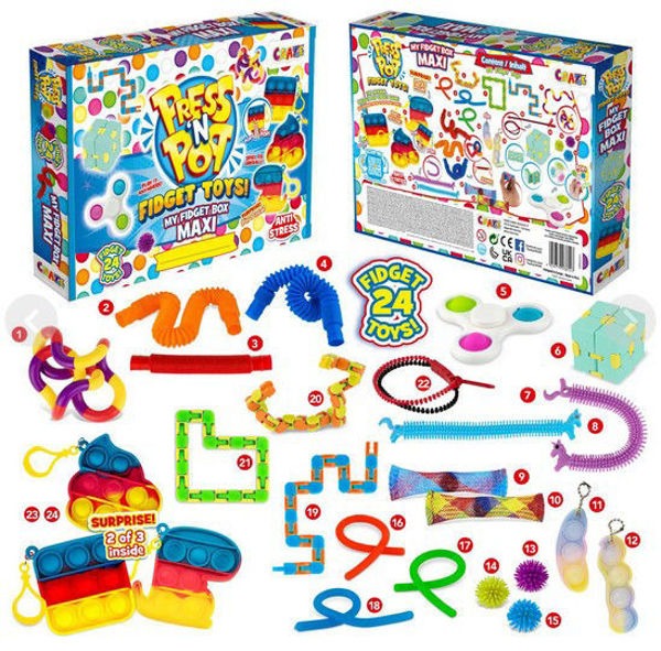 Die PressNPopA+ Fidget Box Maxi ist der absolute Mega-Trend für alle, die Pop-, Drück- und Stressabbauspaß lieben! Das Original PRESS’N’POP Fidget Toy von CRAZE bringt nicht nur endlosen Bubble-Spaß – in dieser Box steckt gleich eine ganze Sammlung an 24 unterschiedlichen Fidget-Toys.