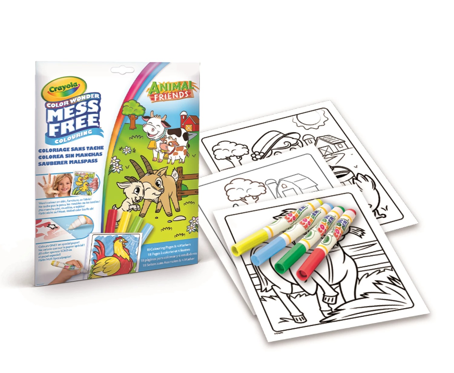 Mit dem Color Wonder Tierfreunde Ausmalset von Crayola wird Malen zum sauberen Vergnügen! Die speziellen Color Wonder Marker besitzen eine farblose Filzstift-Spitze, die ihre Farbe erst auf dem beiliegenden Spezialpapier entwickelt. So entstehen keine Flecken auf Kleidung, Möbeln oder Wänden – perfekt für sorgenfreien Malspaß.