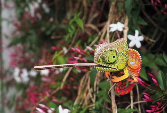 Mit dem 3D Bastelset Chamäleon von EUGY können Kinder und Erwachsene kreativ werden und gleichzeitig umweltbewusst basteln. Aus biologisch abbaubarem Wellkarton entsteht Schritt für Schritt ein detailreiches Chamäleon in 3D.