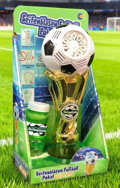 Lieferumfang: Fun Trading Seifenblasen Fussball Pokal mit Licht, 110 ml Seifenblasenflüssigkeit enthalten.
