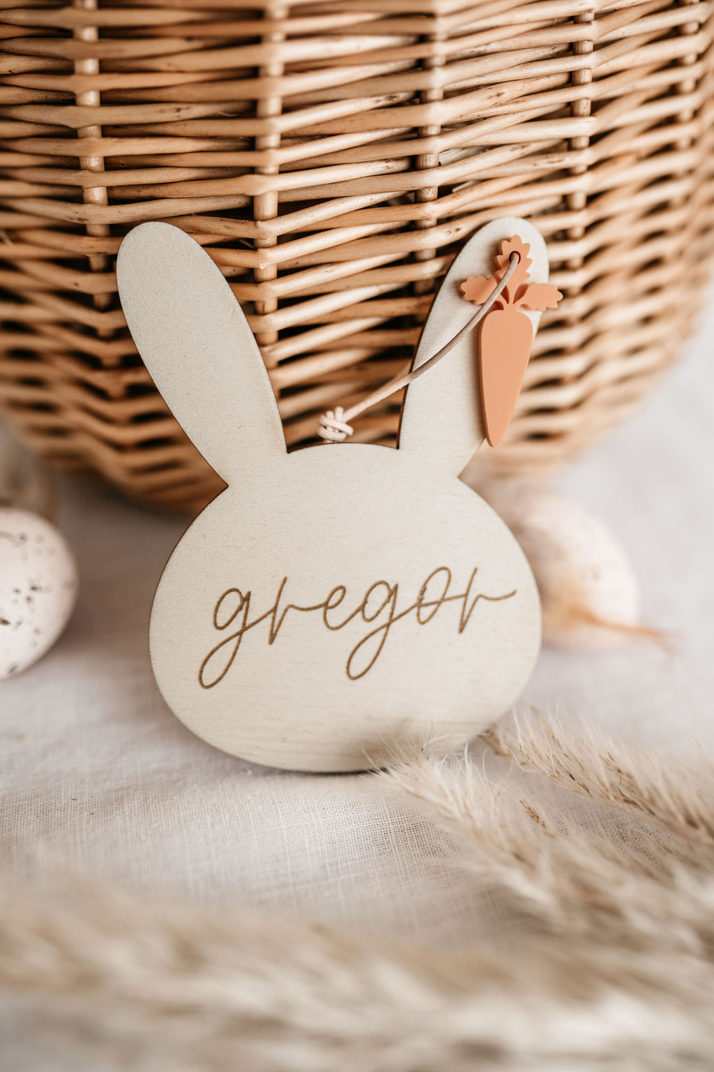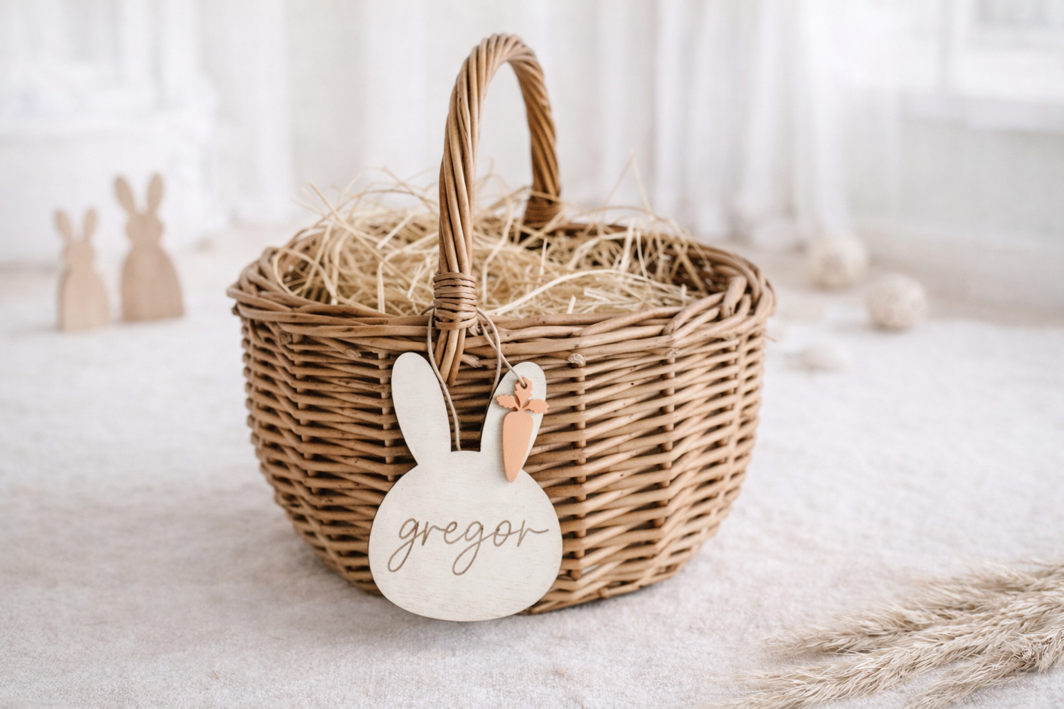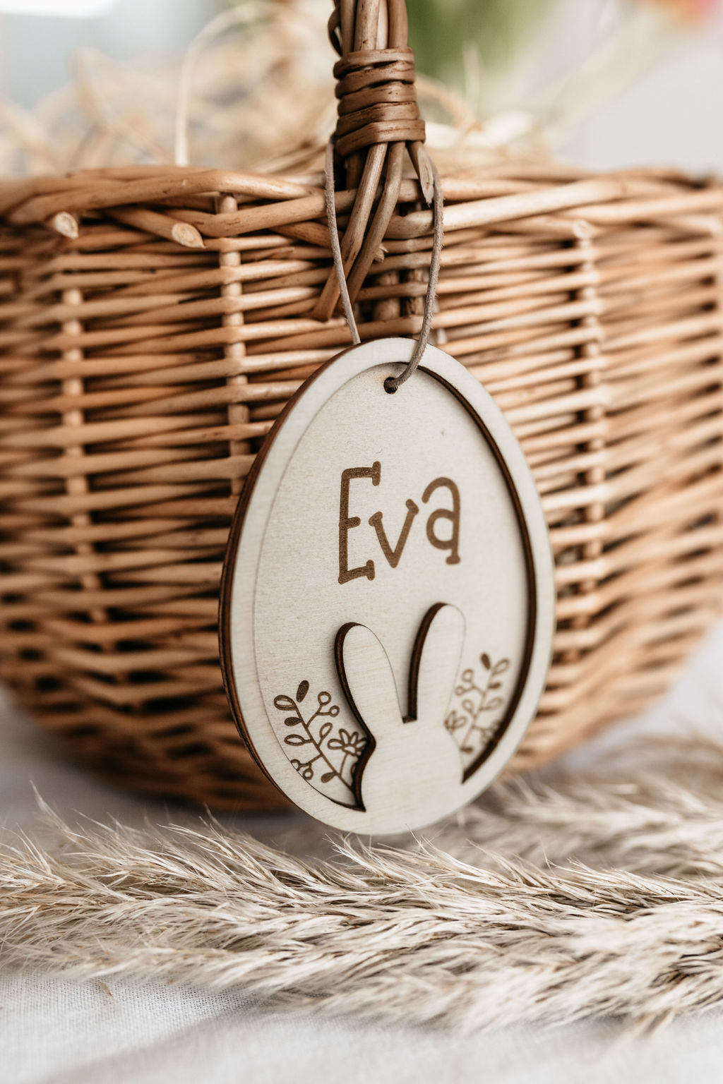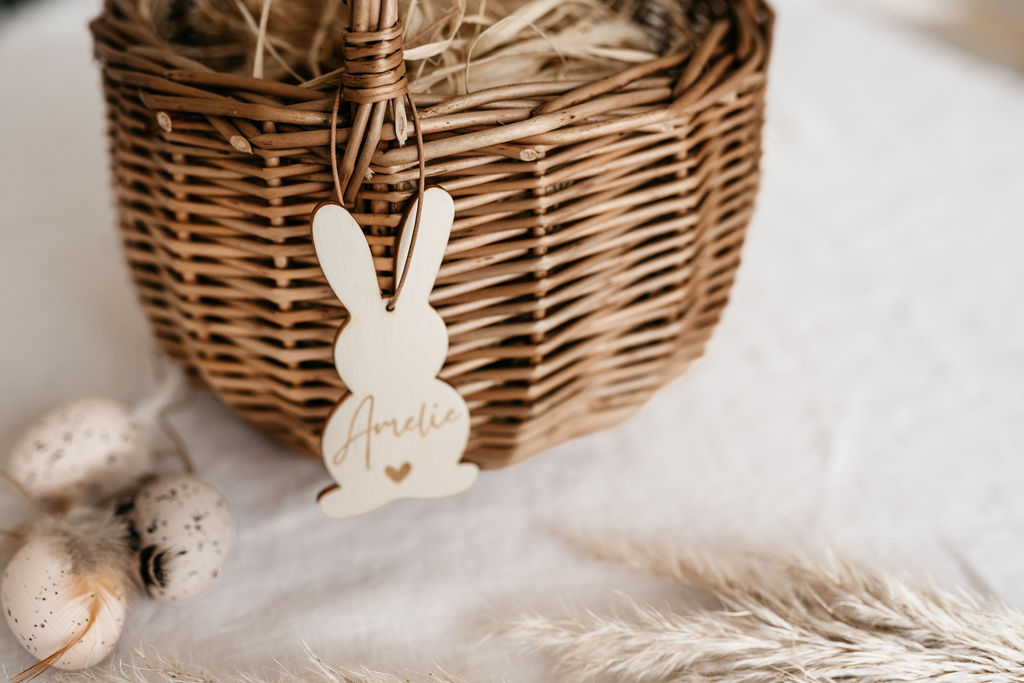 Das Körbchen bietet ausreichend Platz für Ostereier, Süßigkeiten und kleine Überraschungen. Der gravierte Namensanhänger aus Holz verleiht dem Korb eine persönliche Note und kann auch nach Ostern als Erinnerung aufbewahrt oder weiterverwendet werden.