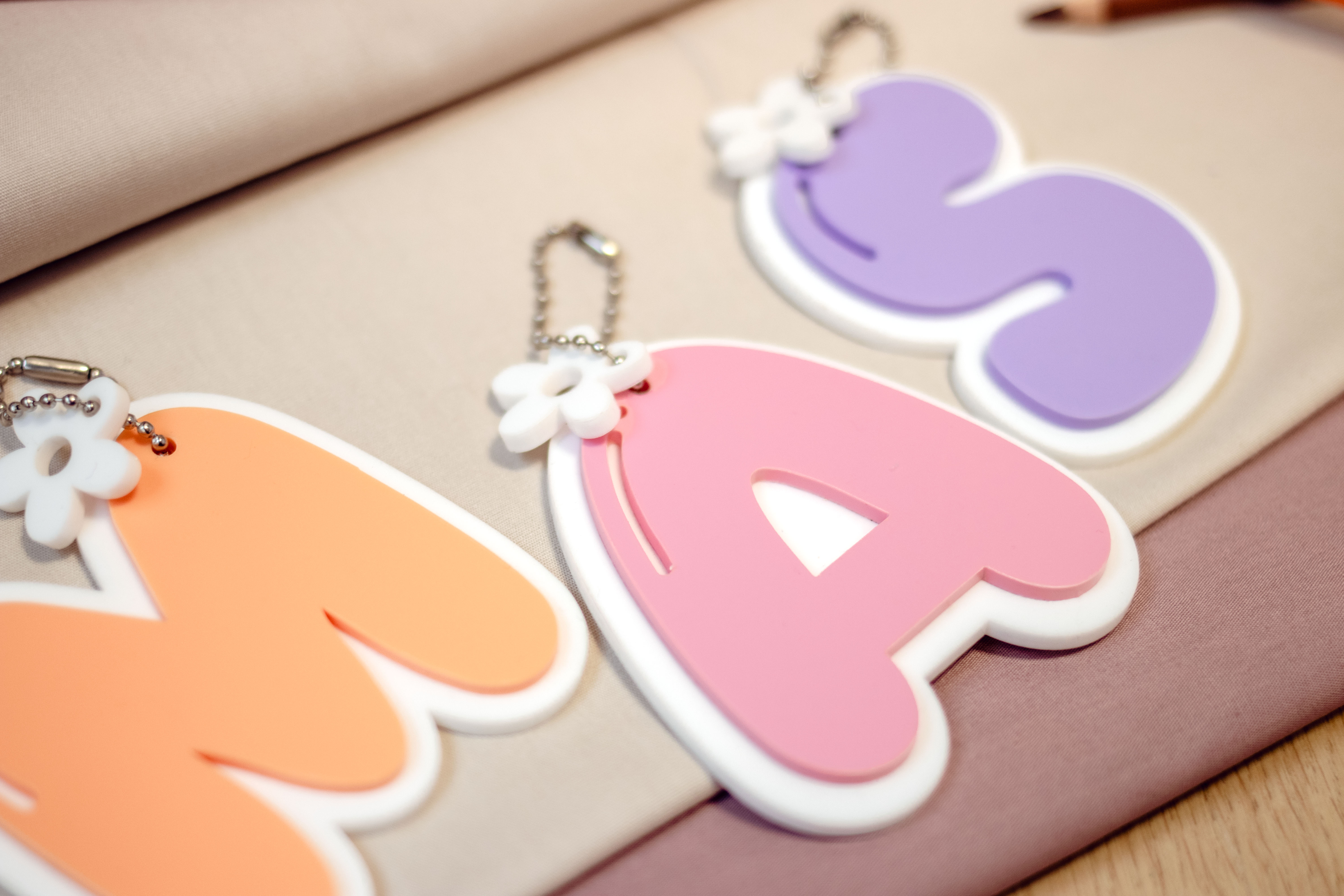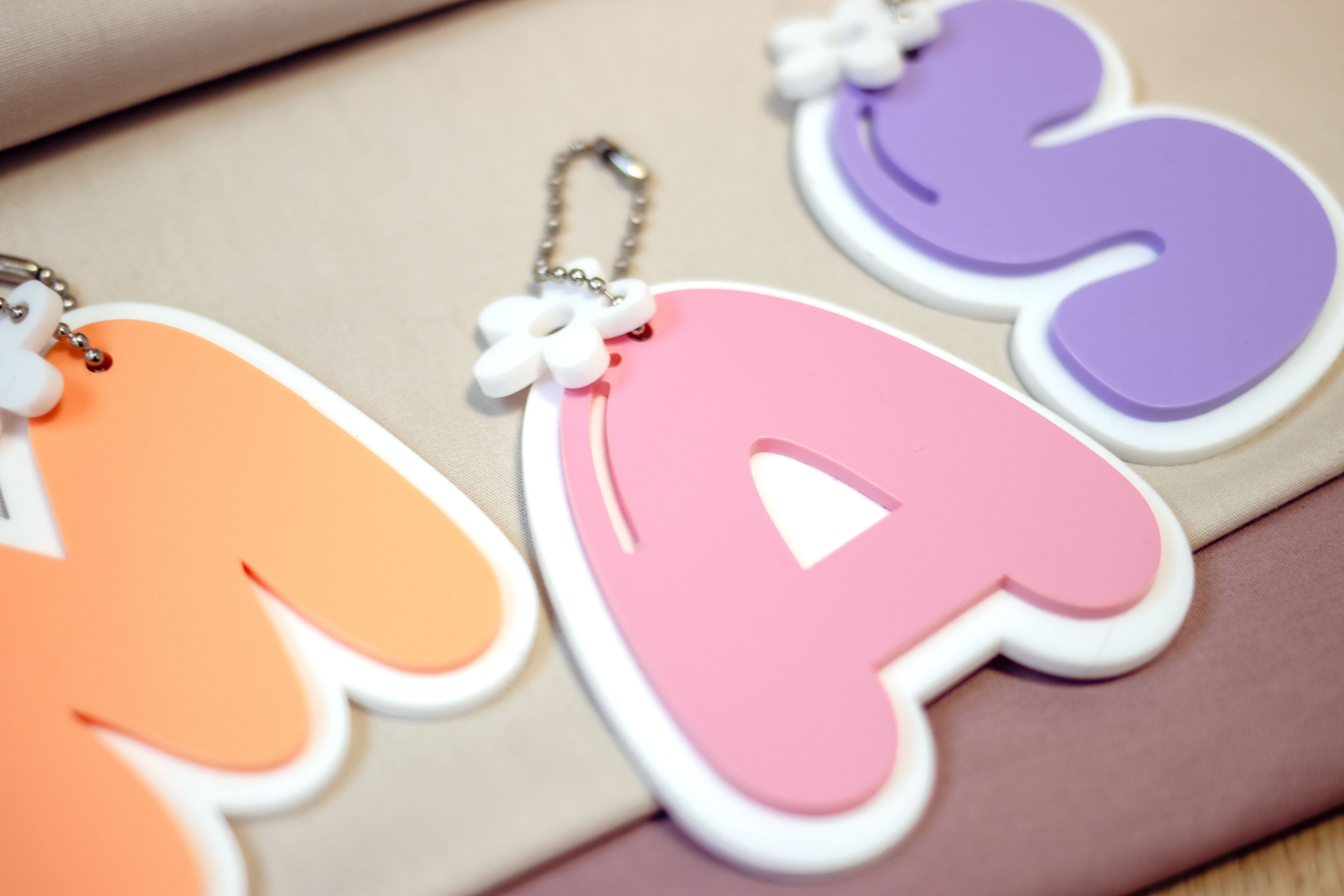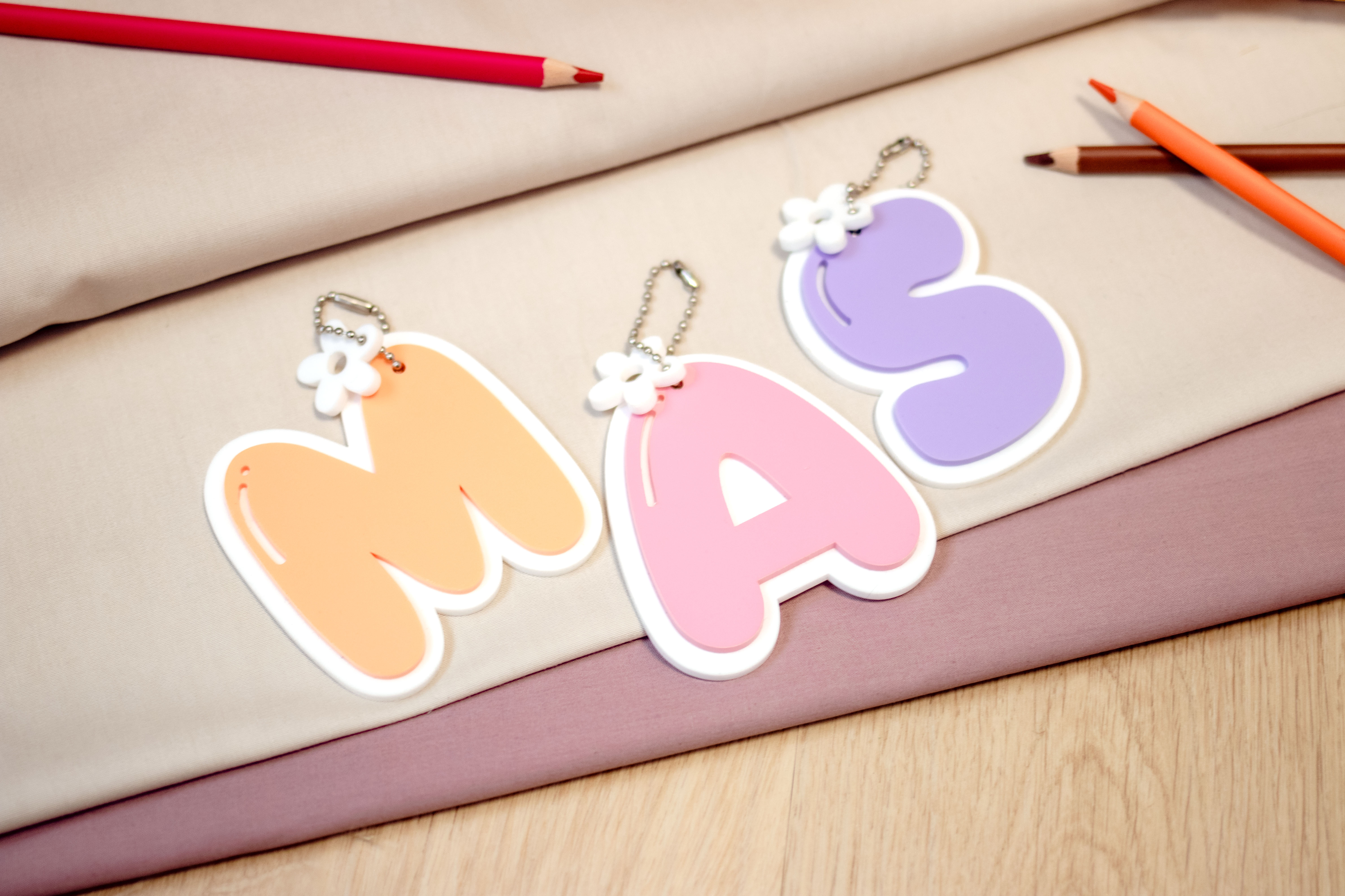 Design: Großer Buchstabe in Comic-Schrift mit weißem Blümchen-Charm