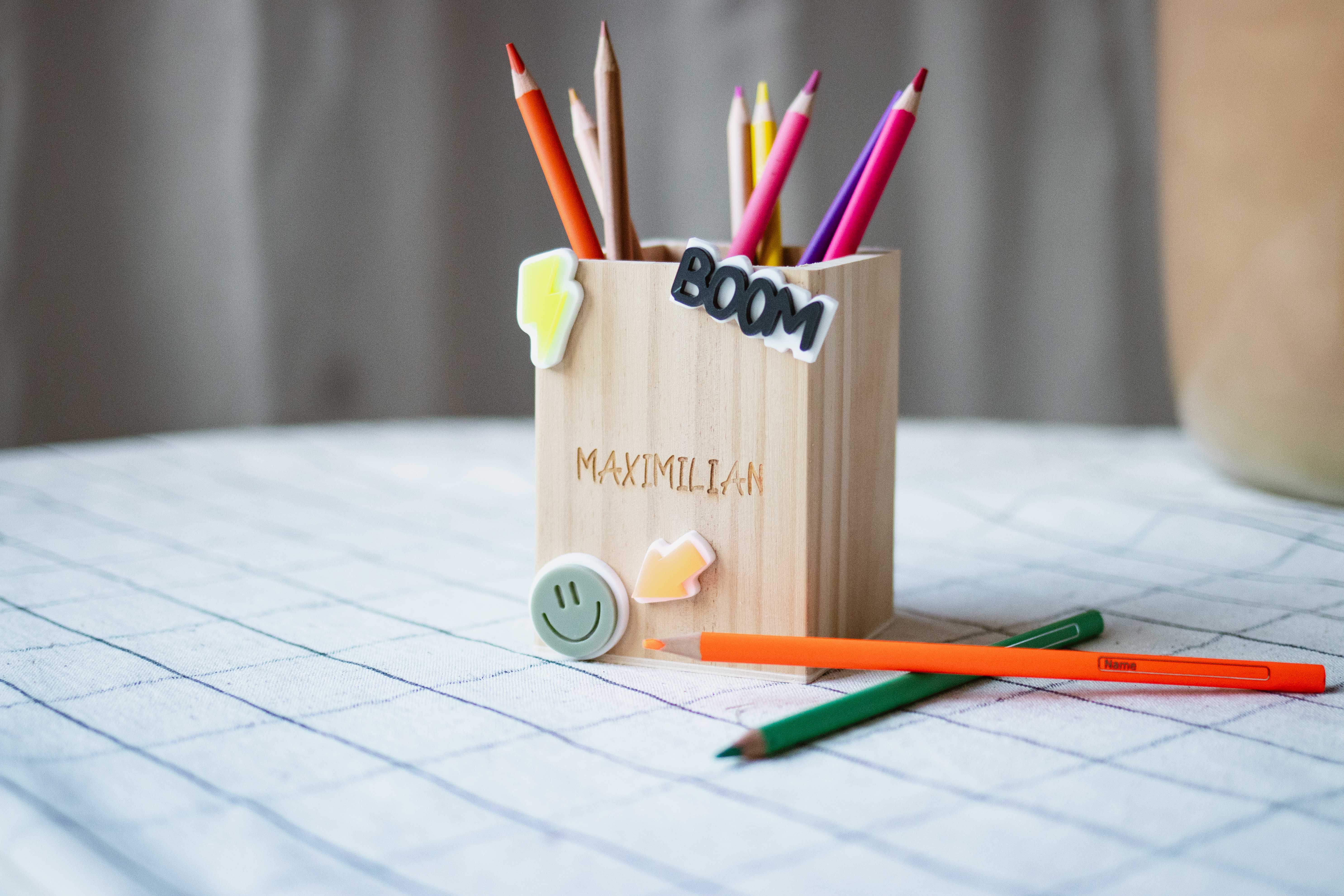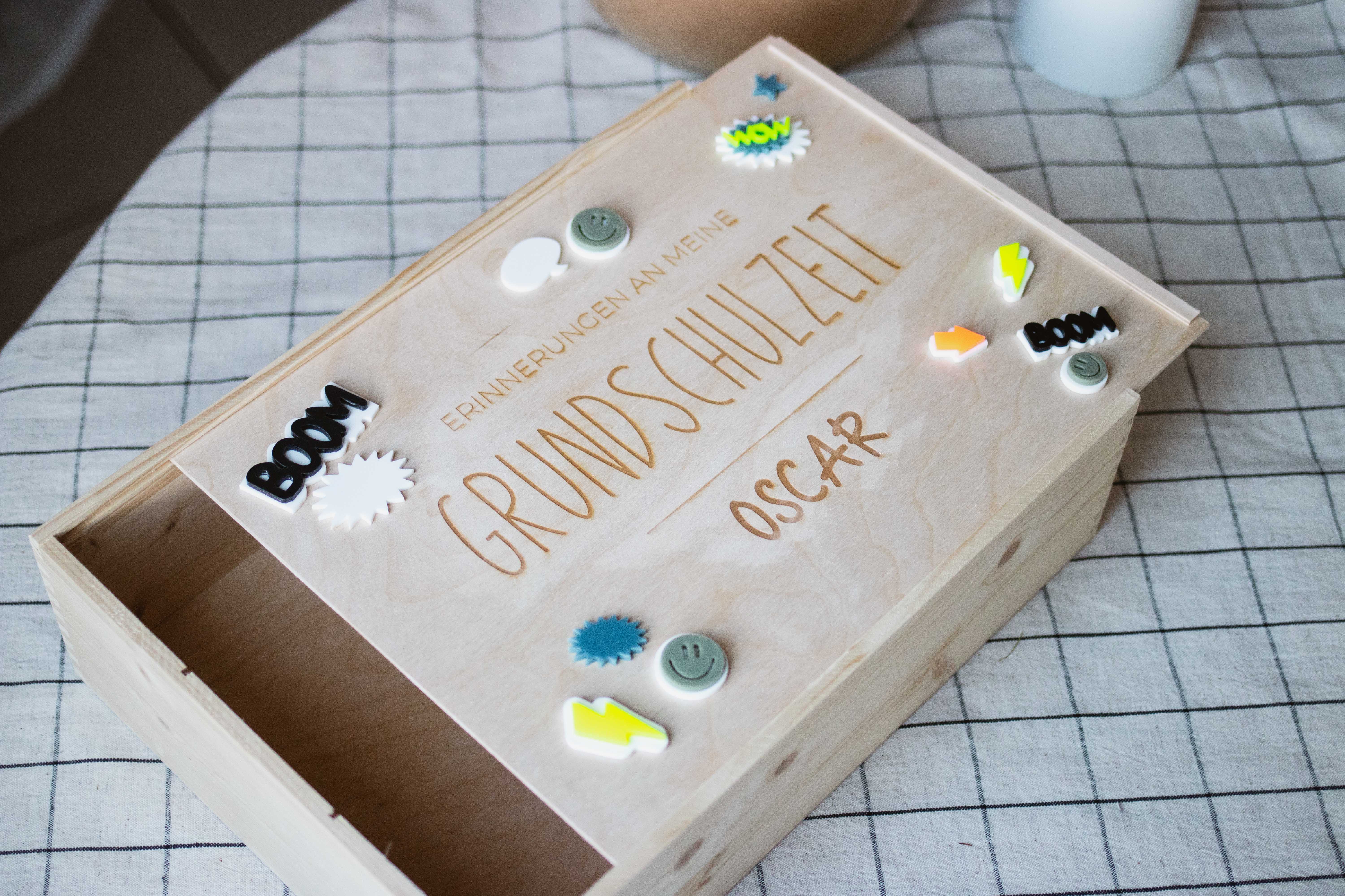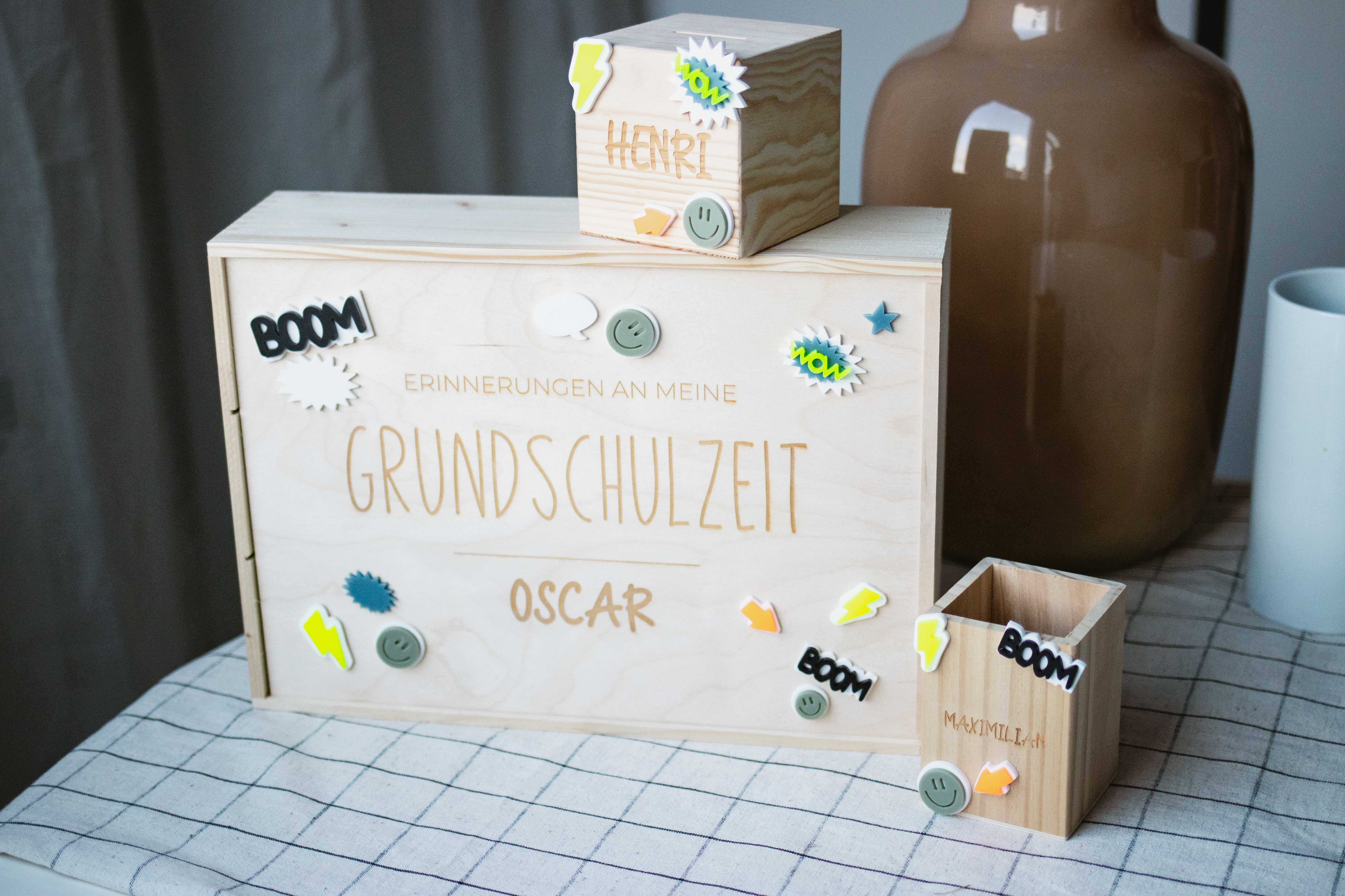 Eine Erinnerungskiste, in der du besonders tolle Kunstwerke, Fotos, Ausflügserinnerungen, Basteleien oder andere Erinnerungen der Schulzeit sammeln kannst, eine Spardose, damit du dir einen Wunsch erfüllen kannst und der Stiftebecher, für deinen Lieblingsstifte.