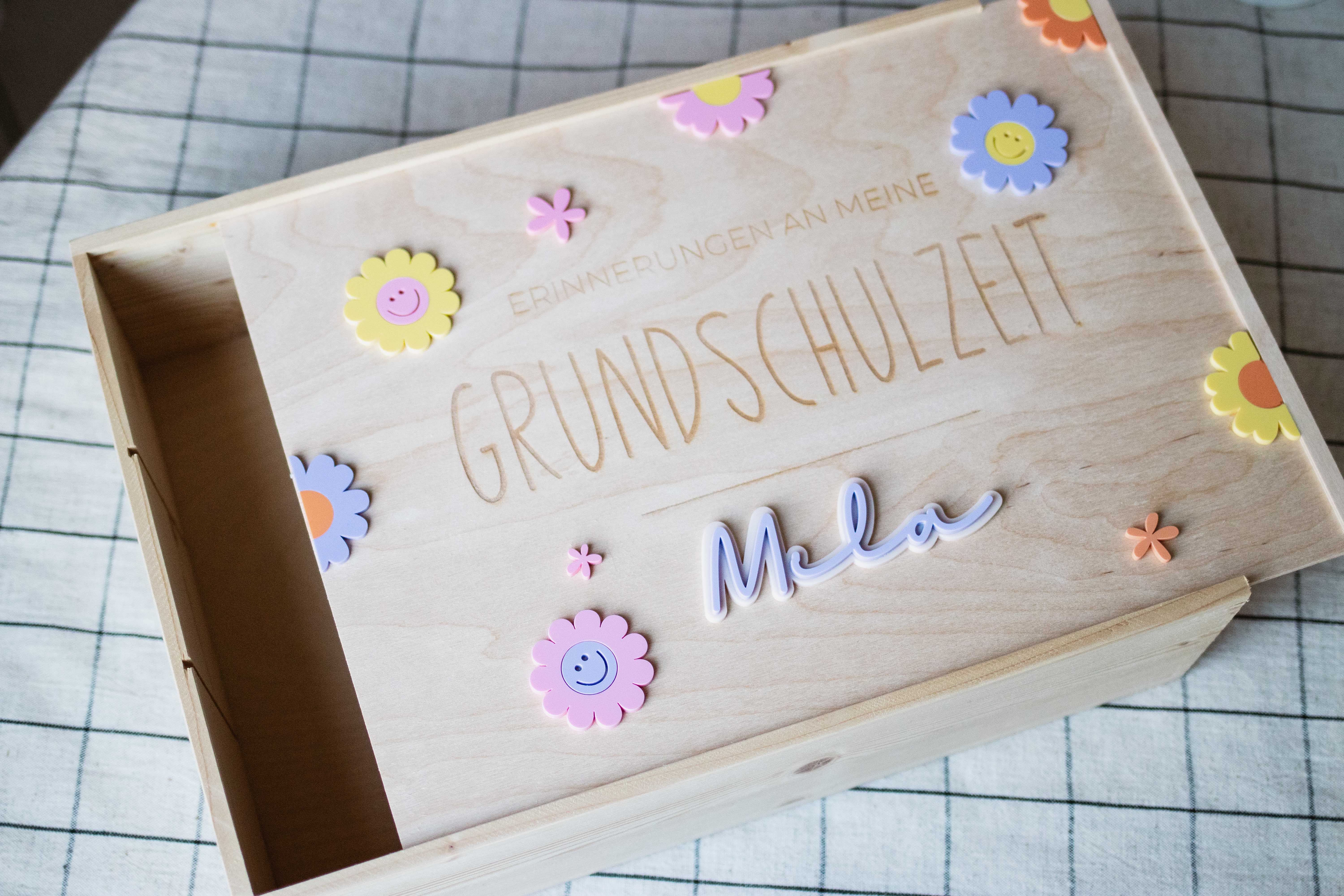 Eine Erinnerungskiste, in der du besonders tolle Kunstwerke, Fotos, Ausflügserinnerungen, Basteleien oder andere Erinnerungen der Schulzeit sammeln kannst, eine Spardose, damit du dir einen Wunsch erfüllen kannst und der Stiftebecher, für deinen Lieblingsstifte.