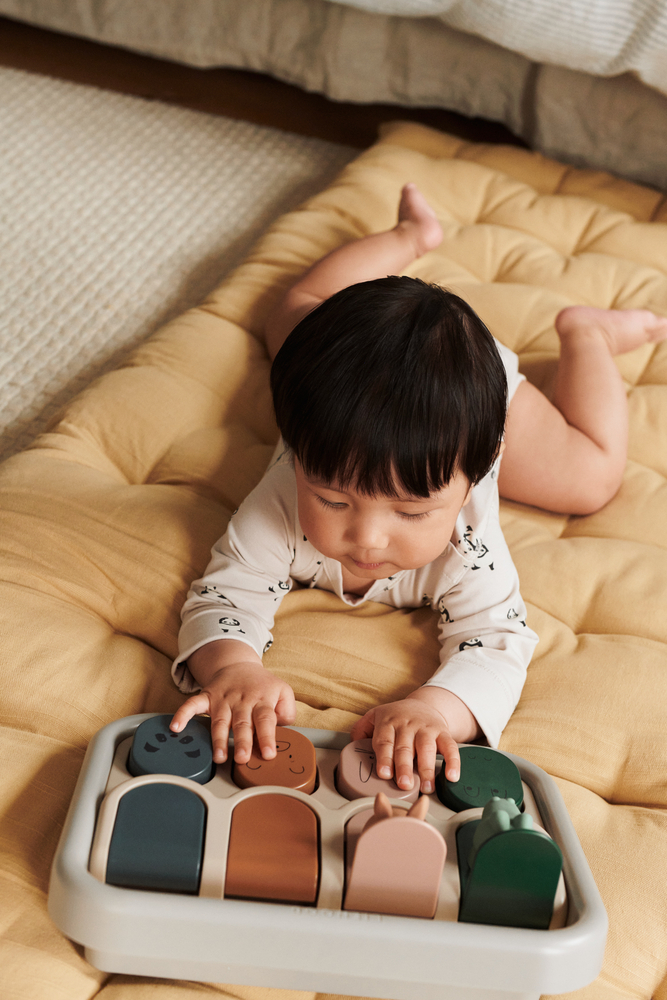 Die farbenfrohen Figuren bestehen aus 100 % weichem Silikon, während Basis und Knöpfe aus 60 % recyceltem ABS gefertigt sind. Dank des großen Tragegriffs lässt sich das Spielzeug problemlos überallhin mitnehmen – perfekt für Spielzeit zu Hause oder unterwegs.
