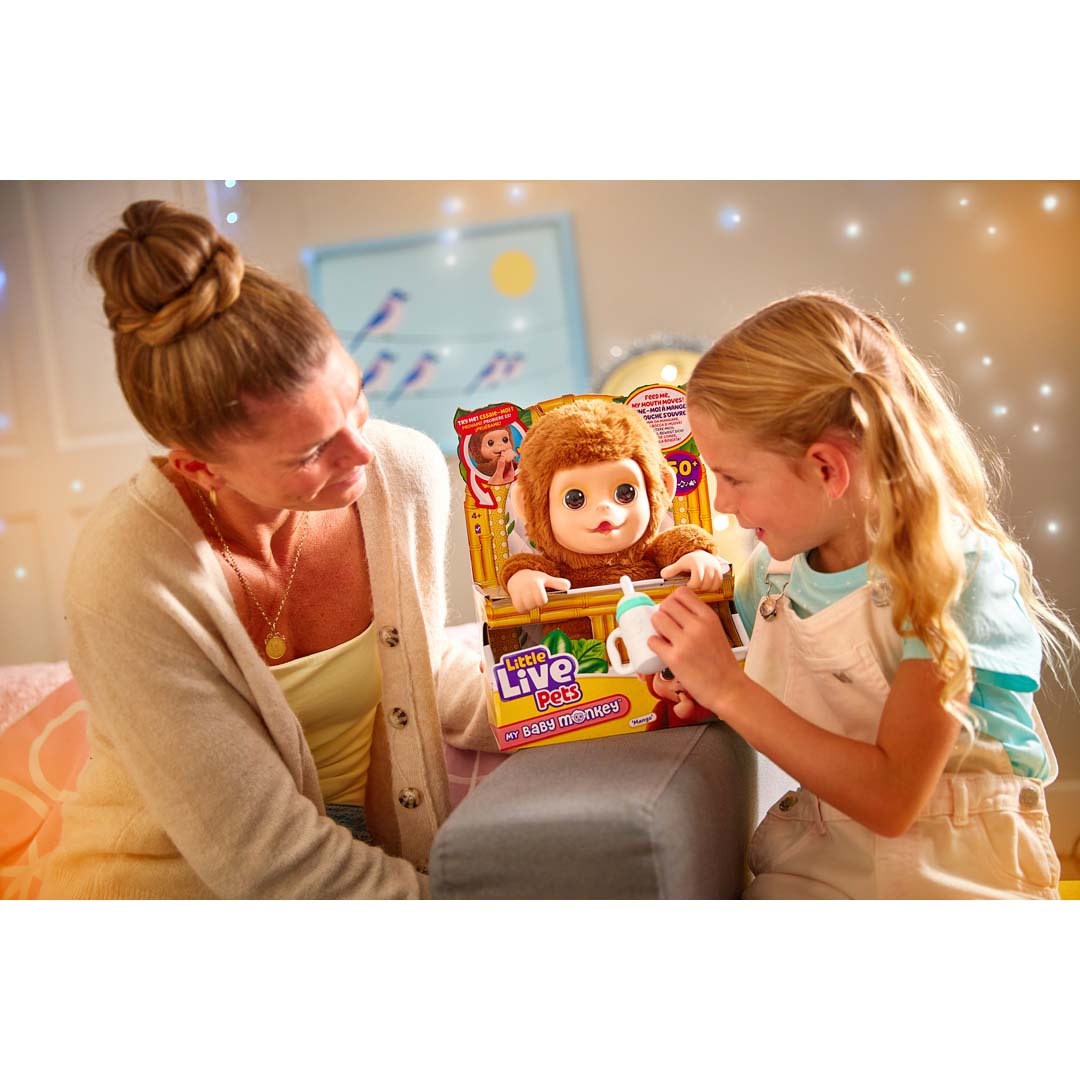 Mit Mango, dem Babyäffchen, bringt Little Live Pets realistischen Kuschelspaß ins Kinderzimmer! Das interaktive Plüschtier reagiert auf Berührungen, bewegt Mund, Hände und Füße, plappert, lässt sich füttern und hält sich an Gegenständen fest.
