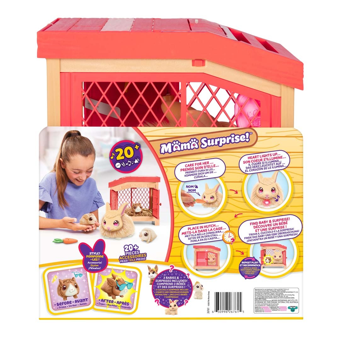 Mit dem Mama Surprise Hasen-Spielset erleben Kinder einen ganz besonderen Moment voller Nähe, Fürsorge und Spannung. Die weiche, interaktive Hasen-Mama reagiert liebevoll auf Zuwendung: Sie liebt es, gebürstet, gefüttert und gestreichelt zu werden. Wenn ihr Herz leuchtet, ist es so weit – setze sie in ihren Stall und warte gespannt auf die Überraschung!