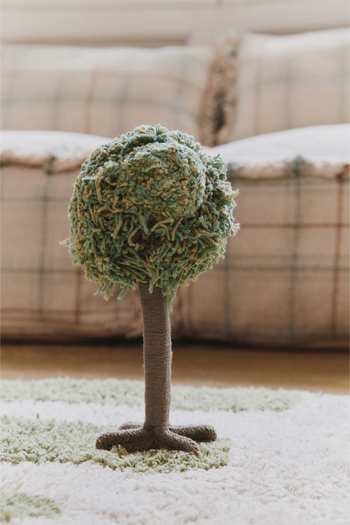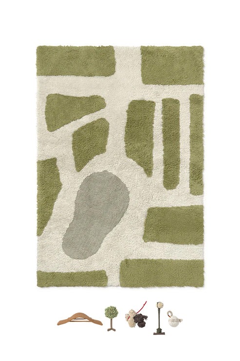 Das Besondere: Zum Teppich gehören fünf handgefertigte Accessoires – ein Baum, eine Straßenlaterne, eine Brücke, ein Hund und ein Schwan. Alle liebevoll gestalteten Figuren werden in einer praktischen Baumwolltasche geliefert und regen zum interaktiven Rollenspiel an.