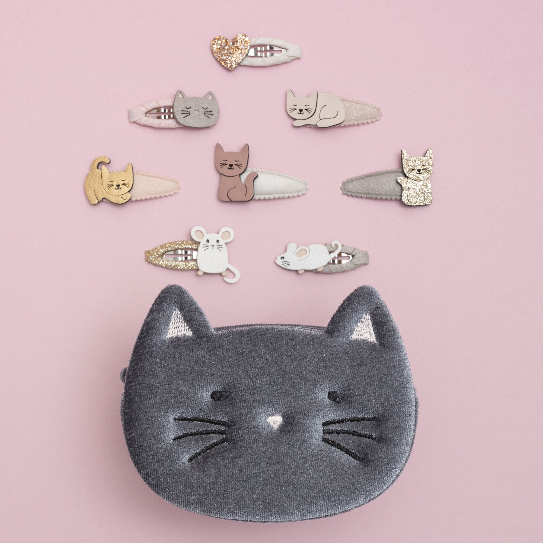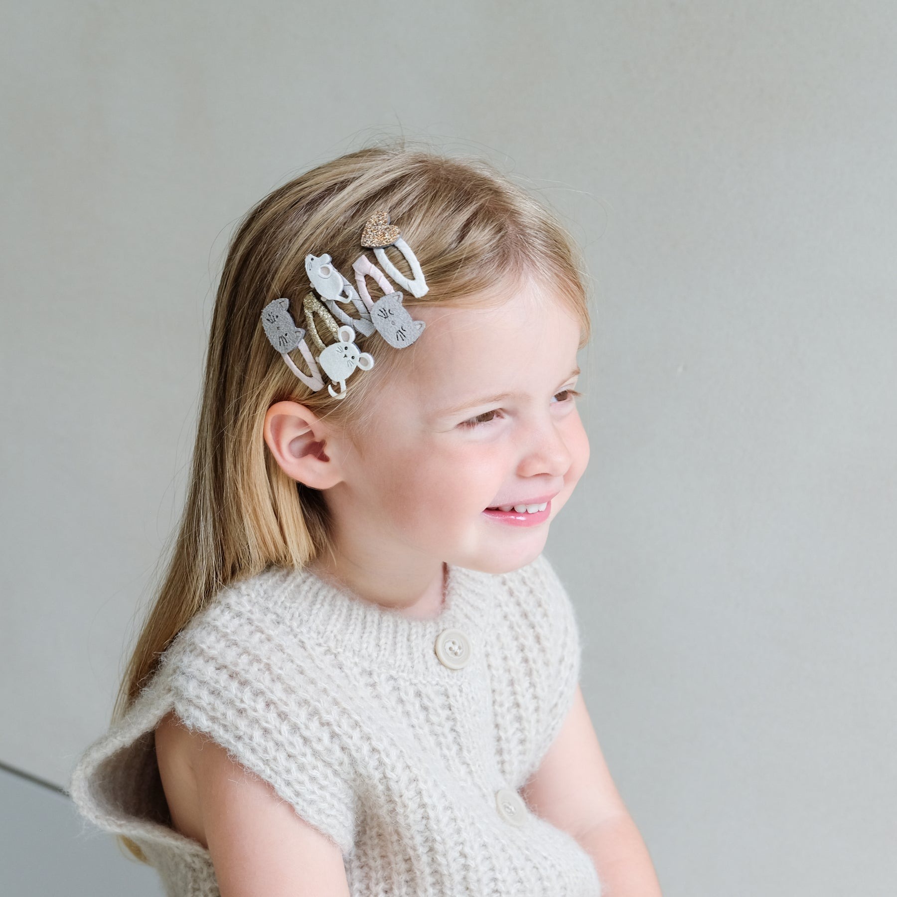 Sag Hallo zu den supersüßen Haarspangen Mini Katze & Maus von Mimi & Lula! Das Set enthält 5 Clips (je ca. 4 cm) mit zwei Kätzchen, zwei Mäusen und einem glitzernden Herz – perfekt zum Mixen & Matchen für viele niedliche Frisuren.