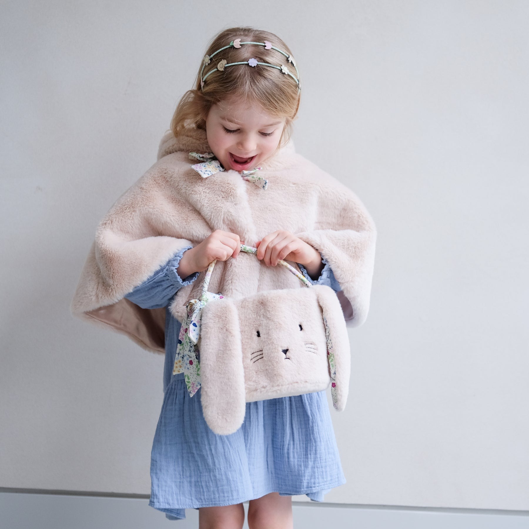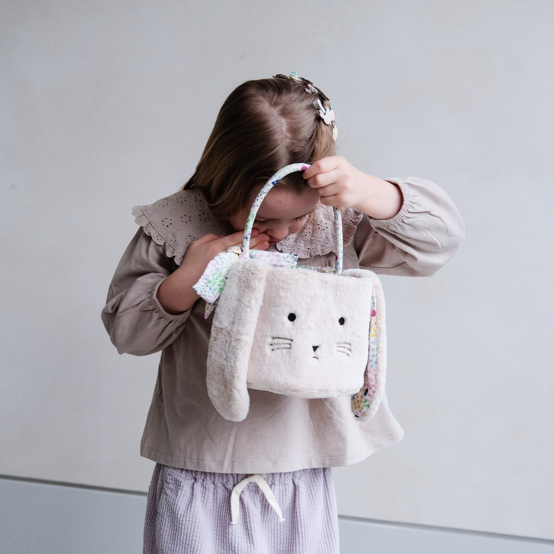Hergestellt aus dem weichsten, mit Blumen gefütterten Pelzstoff, komplett mit Schlappohren, Tragegriff und handgebundener Schleife mit einem süßen gestickten Hasengesicht und einem Pomponschwanz!