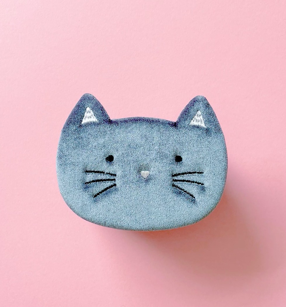 - Material: weicher grauer Samt mit gestickten Katzen-Details