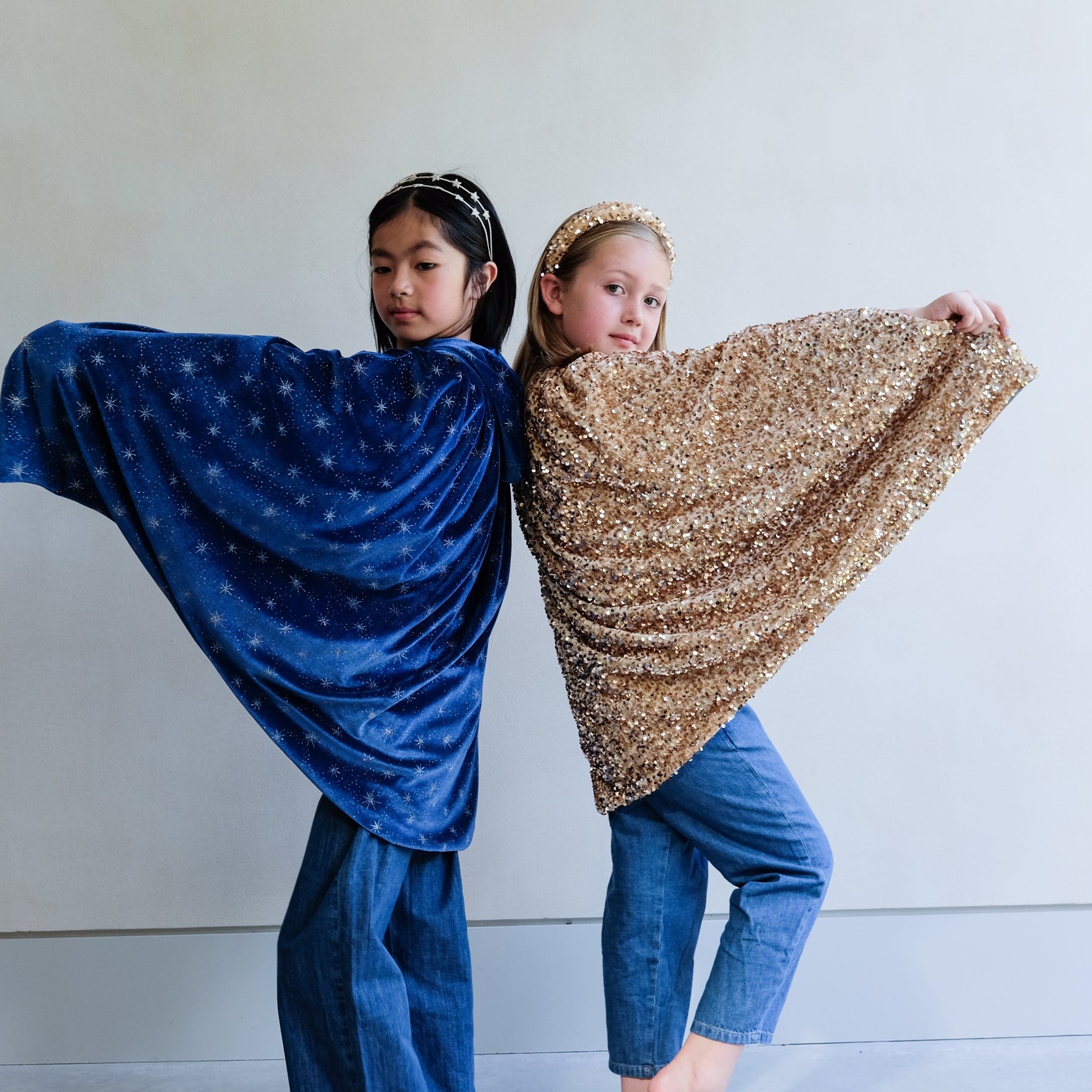 Der goldene, paillettenverzierte Umhang ist innen mit weichem grauem Satin gefüttert und lässt sich mit einer Schleife samt Druckknopf sicher schließen.