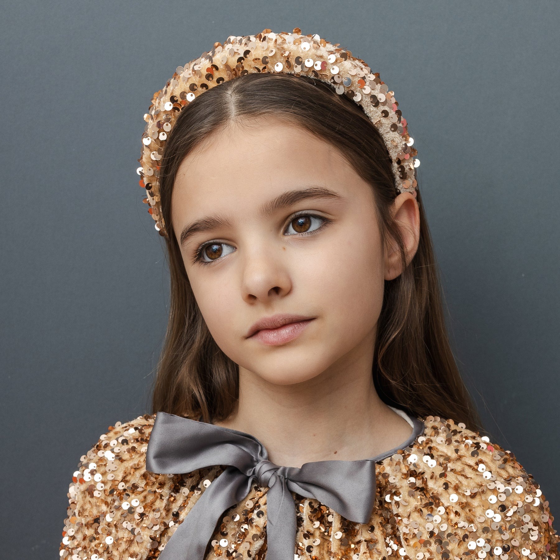 - Material: goldene Pailletten, weiches graues Satinfutter