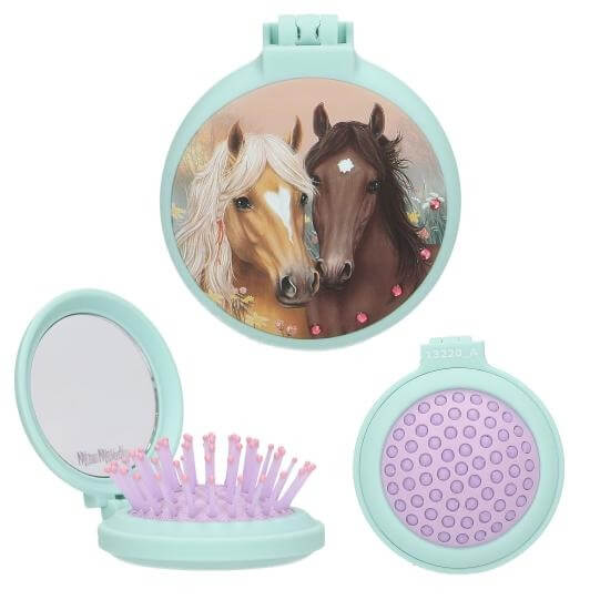 Diese runde Klapp-Haarbürste von Miss Melody ist nicht nur praktisch, sondern auch wunderschön gestaltet. Außen schmücken hübsche Pferde-Motive mit funkelnden Strass-Steinchen die Bürste. Innen befindet sich ein Spiegel, und beim Aufklappen stellen sich die Borsten automatisch auf.
