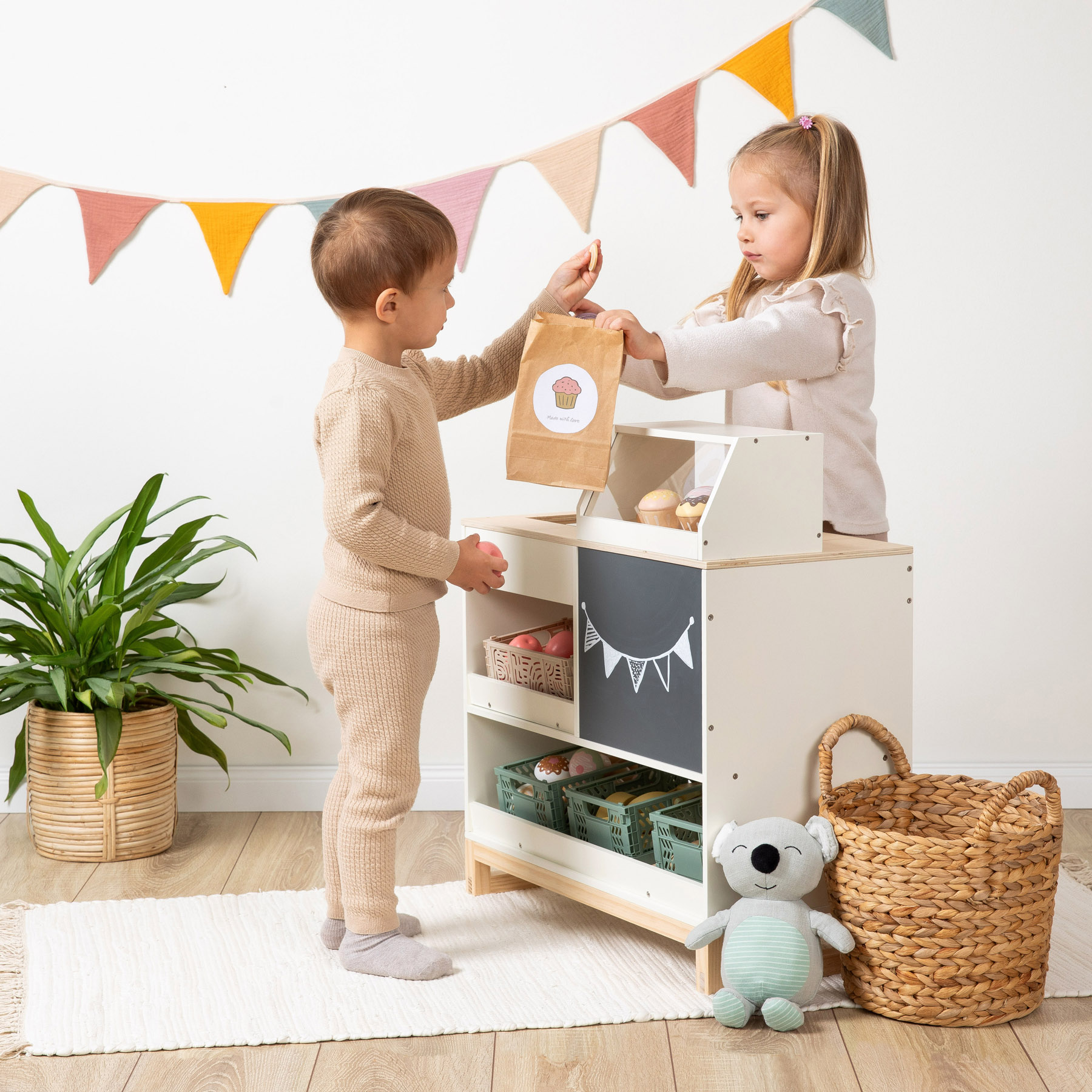 Hey, kleiner Händler! Der kompakte Kaufladen von Musterkind aus nachhaltigem Holz bringt echtes Markt-Feeling direkt ins Kinderzimmer. Trotz seiner handlichen Größe bietet er zahlreiche Auslagen, die reichlich Platz für Obst, Gemüse, Backwaren oder andere Lieblingsprodukte schaffen.