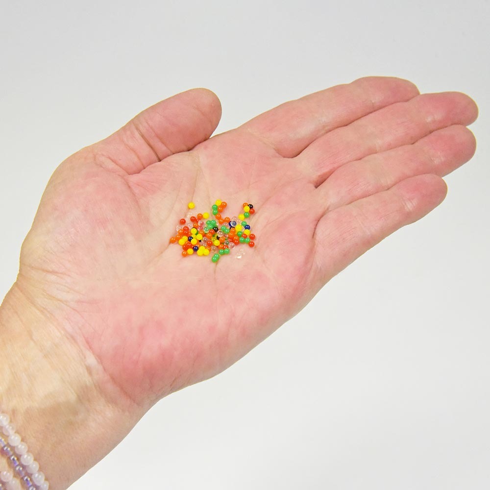 Die bunten Wasserperlen sind vielseitig einsetzbar und faszinieren durch ihre Verwandlung: In trockenem Zustand haben sie eine Größe von ca. 2–2,5 mm und sind hart. Legt man sie für 4–6 Stunden ins Wasser, wachsen sie auf beeindruckende 9–11 mm heran und werden elastisch. Perfekt geeignet als kreative Dekoration für Partys, Hochzeiten oder Blumenvasen. Außerdem lassen sich mit ihnen tolle DIY-Ideen umsetzen, wie z. B. ein selbstgemachter Antistressball, wenn die Perlen in einen Luftballon gefüllt werden.