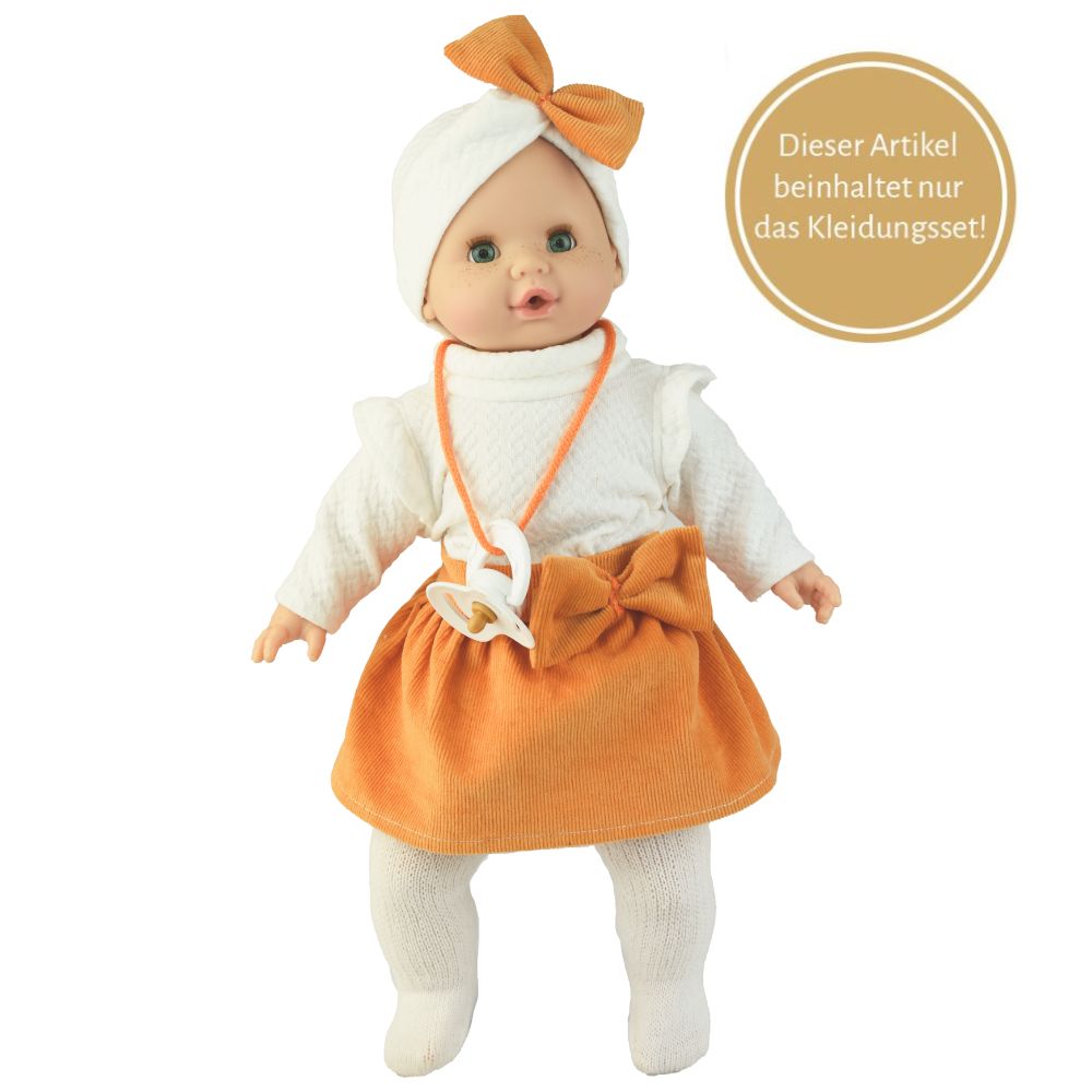 Das liebevoll gestaltete Outfit besteht aus einem leuchtend orangefarbenen Rock, kombiniert mit einem weißen Oberteil und einer weichen Strumpfhose. Das passende Haarband mit gleichfarbiger Schleife rundet den Look harmonisch ab.
