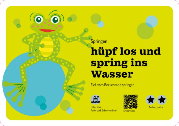 Mit diesem liebevoll gestalteten Kartenset mit 15 Schwimmkarten wird das Schwimmenlernen für Kinder spielerisch und stressfrei – ganz ohne strengen Kurs, aber mit viel Freude und Erfolgserlebnissen. Die 15 robusten, wasserfesten DIN-A5-Karten enthalten über 50 praxiserprobte Übungen zur Wassergewöhnung und zu den Grundtechniken des Schwimmens: vom Gleiten über Schweben bis hin zu Antreiben und Springen.