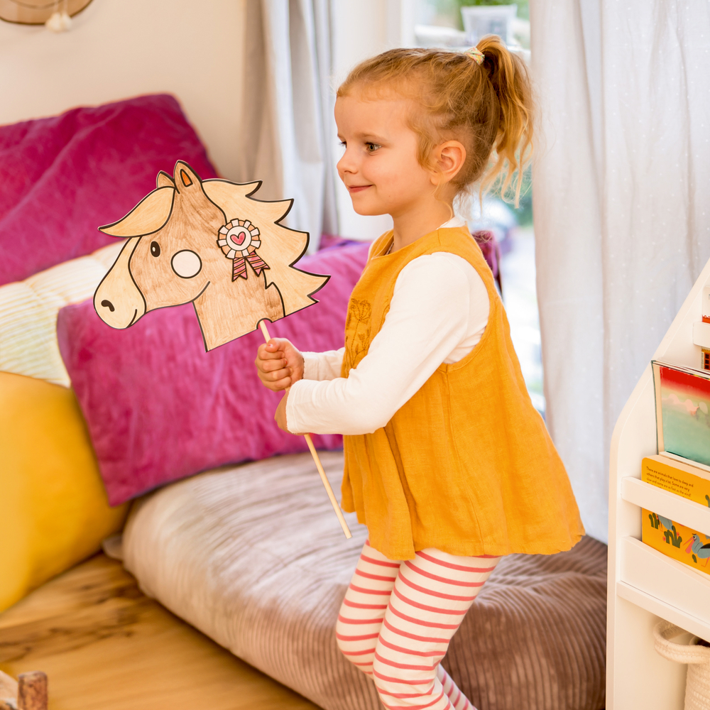 Mit dem Spiegelburg Steckenpferd-Bastelset „Mein kleiner Ponyhof“ können Kinder ihre eigenen Steckenpferde gestalten. Das Set enthält: 6 Pferdefiguren zum Ausmalen, 6 Kokarden, 6 Holzstäbe und 60 transparente Klebepunkte zum Befestigen. Kinder können die Pferde individuell gestalten und anschließend damit spielen. Das Bastelset fördert Kreativität, Feinmotorik und Fantasie und ist perfekt für Kindergeburtstage, Ferienaktionen oder einfach für kreative Nachmittage zu Hause.