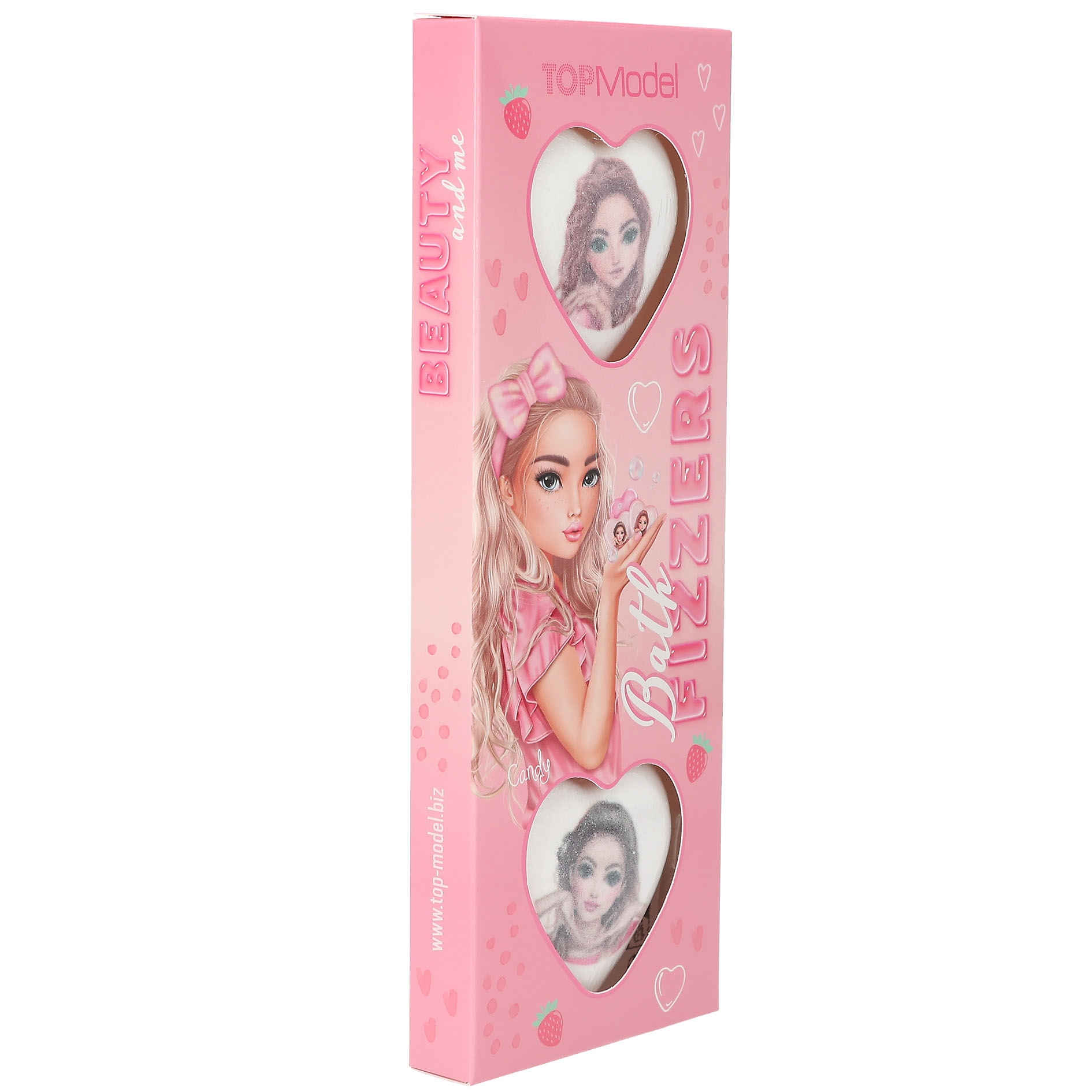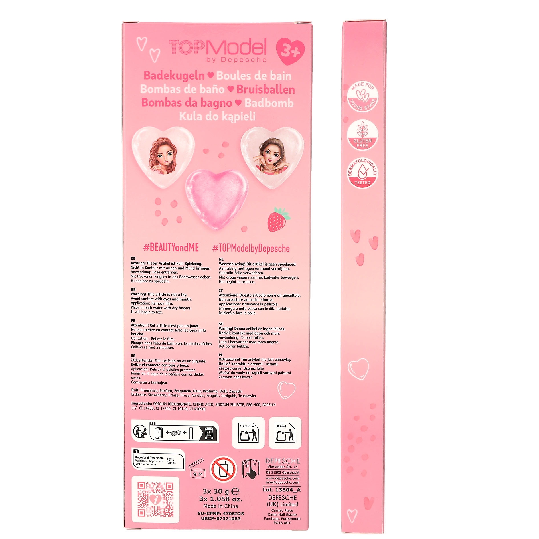 Zauberhafter Badespaß mit Herz: Dieses TOPModel-Set enthält drei herzförmige Badebomben – zwei in Weiß mit süßem Model-Motiv und eine in leuchtendem Pink. Im warmen Wasser sprudeln sie sanft auf und verbreiten einen herrlichen Erdbeerduft. Perfekt für kleine Wellnessmomente!