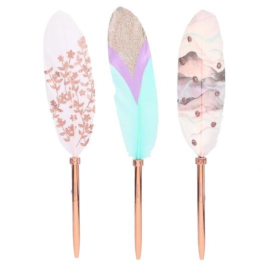 Erlebe traumhaftes Schreibgefühl mit den Federkugelschreibern von TOPModel! Die eleganten Stifte mit roségoldenen Schäften tragen ein dezentes Logo und kommen in drei einzigartigen Feder-Designs: Lila mit roségoldenem Glitzer, Salbeigrün mit roségoldener Spitze, Pastellige Marmorierung mit roségoldenen Punkten. Die schwarze Mine (SCHNEIDER 56 DIN 166554 D1) ist austauschbar, sodass du lange Freude am Schreiben hast.