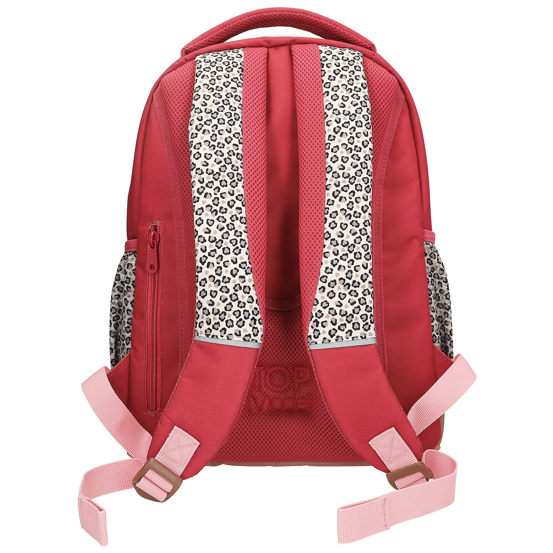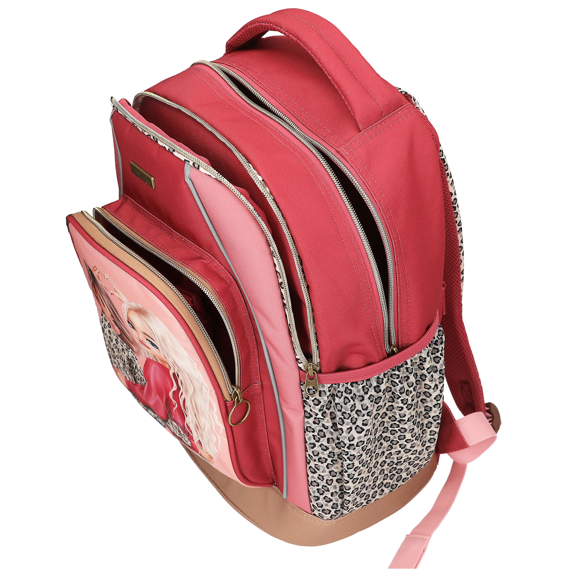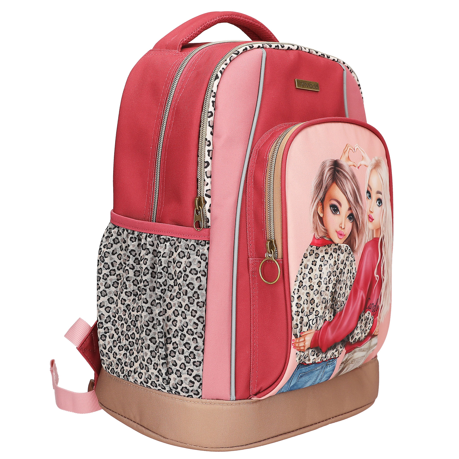 Stylish & praktisch zugleich: Der TOPModel-Schulrucksack überzeugt mit angesagten Leo-Details rundherum und einem großen Doppel-Modelmotiv auf der Fronttasche. In warmem Rosa und beerigem Rot gehalten, wird er durch den edel schimmernden, bräunlichen Boden zum echten Hingucker – und bleibt dabei dank seiner schmutz- und wasserabweisenden Oberfläche alltagstauglich. Mit zwei großen Hauptfächern, seitlichen Taschen, verstellbaren, gepolsterten Schultergurten, einem gepolsterten Rückenteil und einem komfortablen Tragegriff ist er perfekt ausgestattet für Schule und Freizeit.