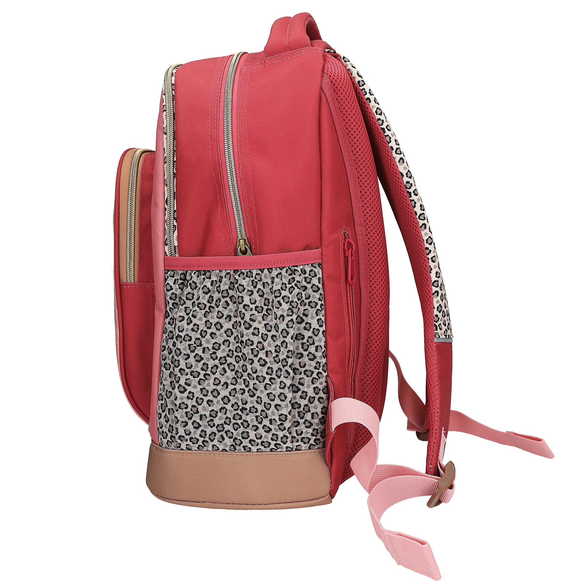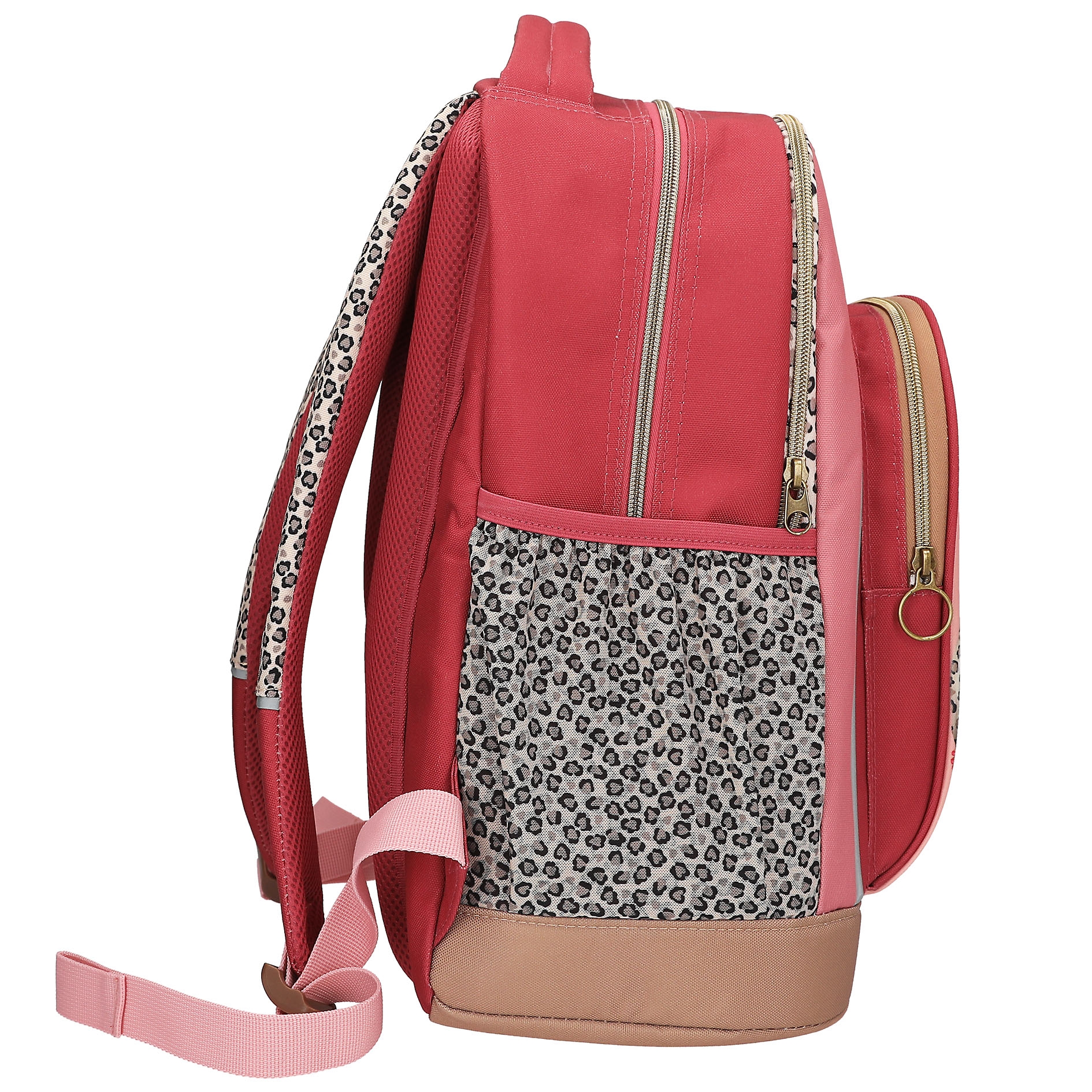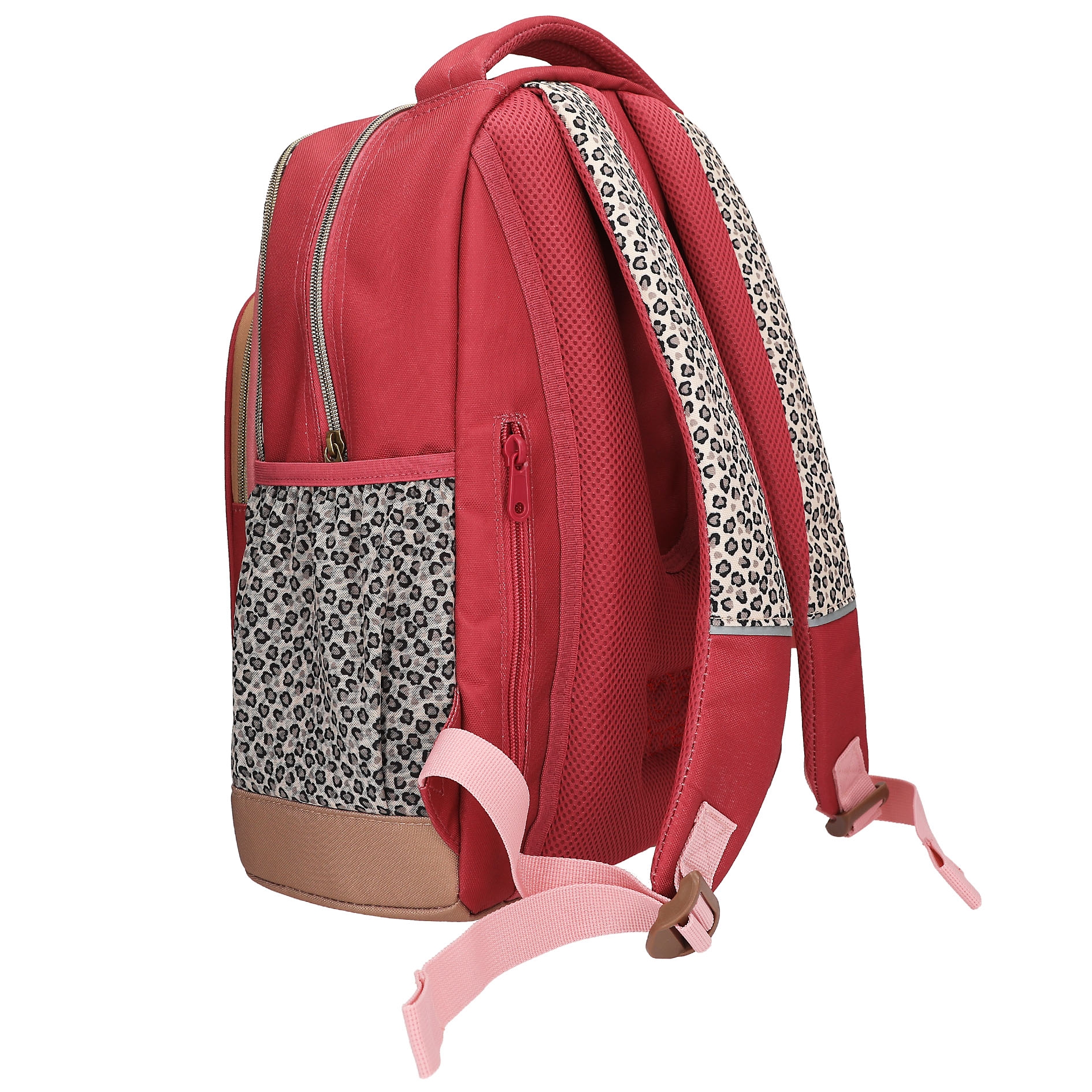 Stylish & praktisch zugleich: Der TOPModel-Schulrucksack überzeugt mit angesagten Leo-Details rundherum und einem großen Doppel-Modelmotiv auf der Fronttasche. In warmem Rosa und beerigem Rot gehalten, wird er durch den edel schimmernden, bräunlichen Boden zum echten Hingucker – und bleibt dabei dank seiner schmutz- und wasserabweisenden Oberfläche alltagstauglich. Mit zwei großen Hauptfächern, seitlichen Taschen, verstellbaren, gepolsterten Schultergurten, einem gepolsterten Rückenteil und einem komfortablen Tragegriff ist er perfekt ausgestattet für Schule und Freizeit.