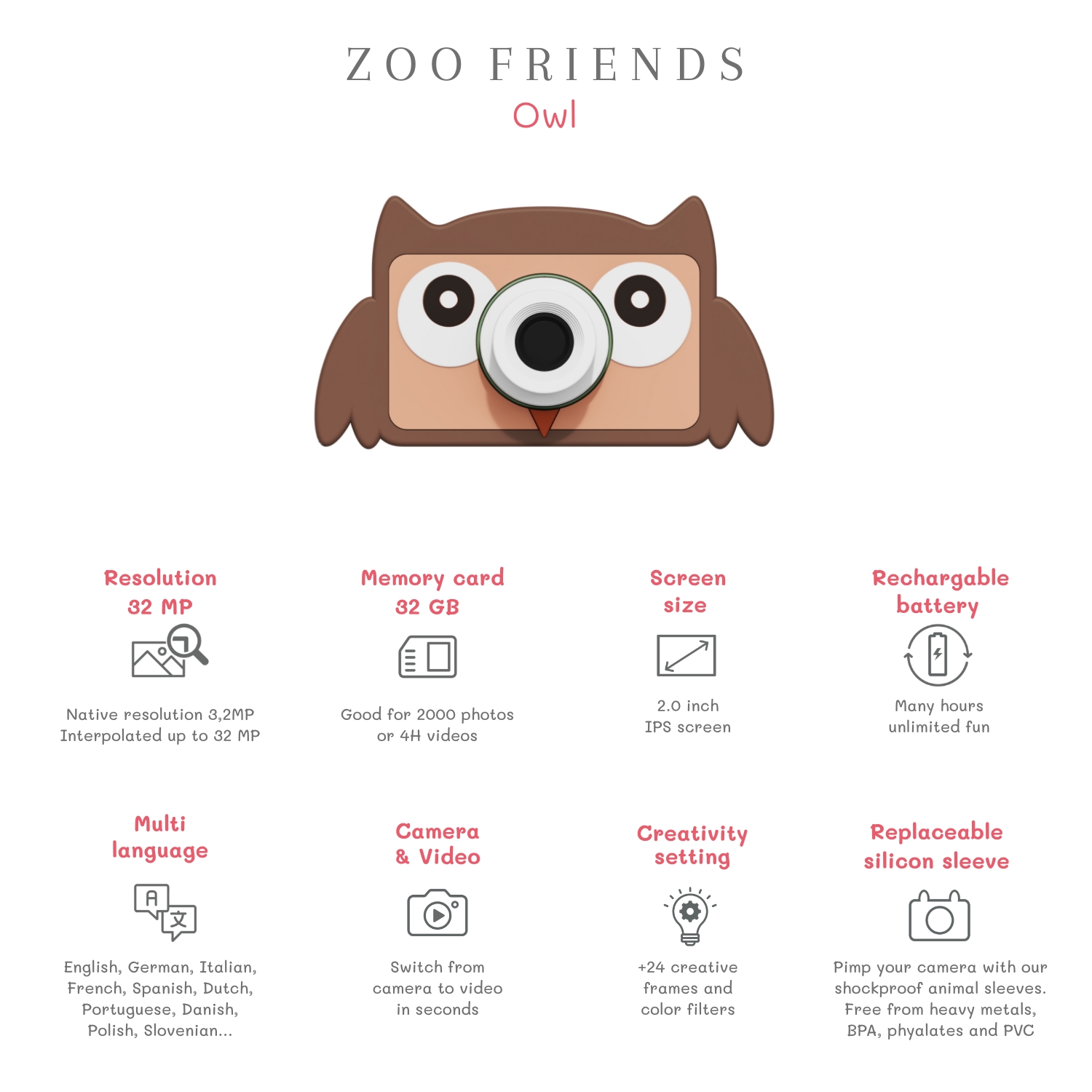 Diese 32-Megapixel-Digitalkamera "Zoo Friends" und der Videorekorder für Kinder von The Zoofamily sind extrem niedlich, klein und leicht. Die Fotos der Kinderkamera können mit Aufklebern und mehr als 20 Digitalkamerafiltern und -rahmen individuell gestaltet werden.
