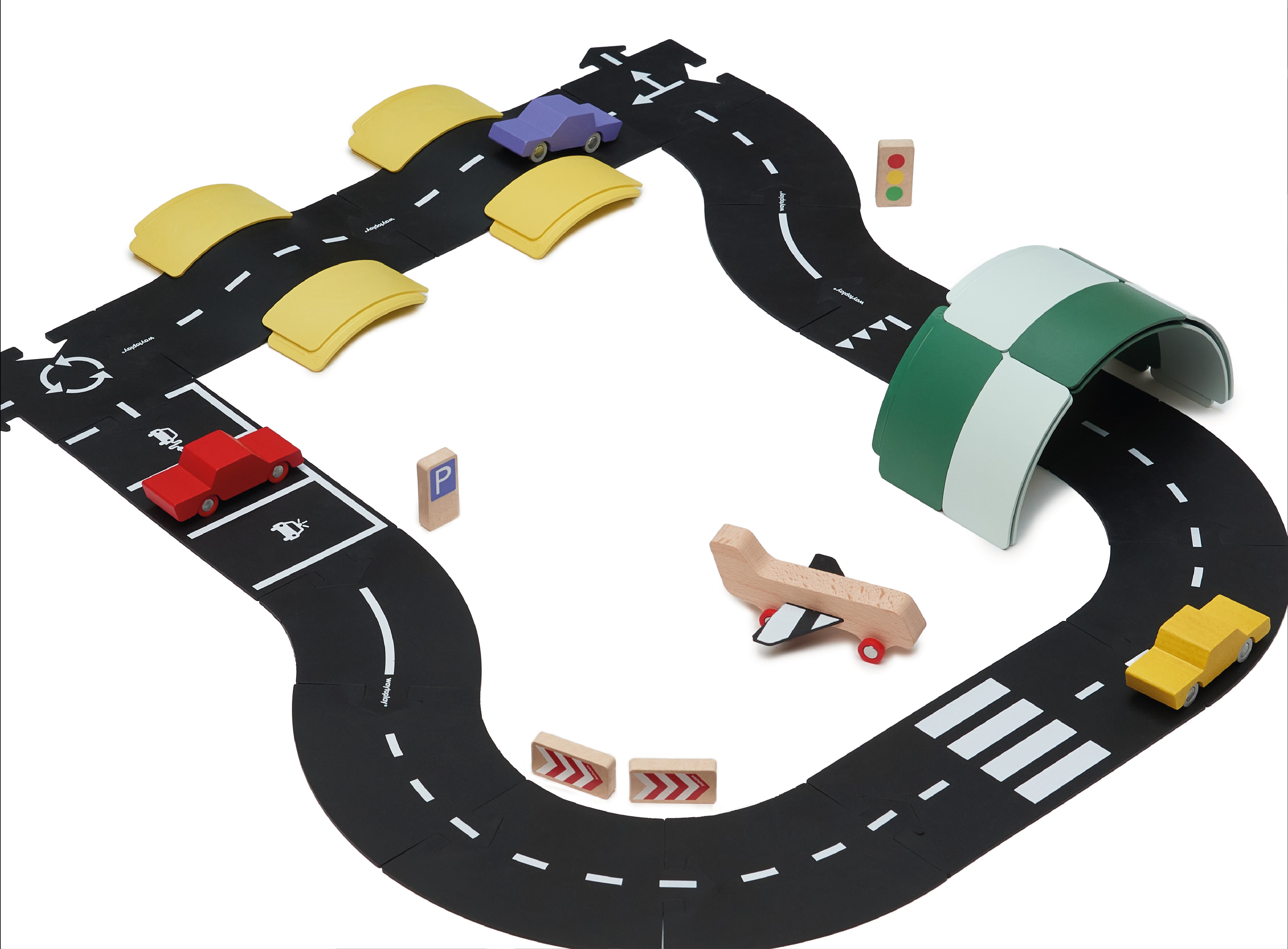 Die flexible Spielstraße waytoplay lässt sich mit einzelnen Gummi-Straßenteilen beliebig zusammen setzen.