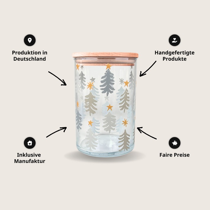 Das Vorratsglas steht für Nachhaltigkeit, Qualität und Herz: gefertigt in der Wunderle Manufaktur, wo Menschen mit und ohne Handicap gemeinsam in liebevoller Handarbeit produzieren. Der Holzdeckel mit Silikondichtung hält den Inhalt lange frisch und sorgt gleichzeitig für ein natürliches, warmes Design.