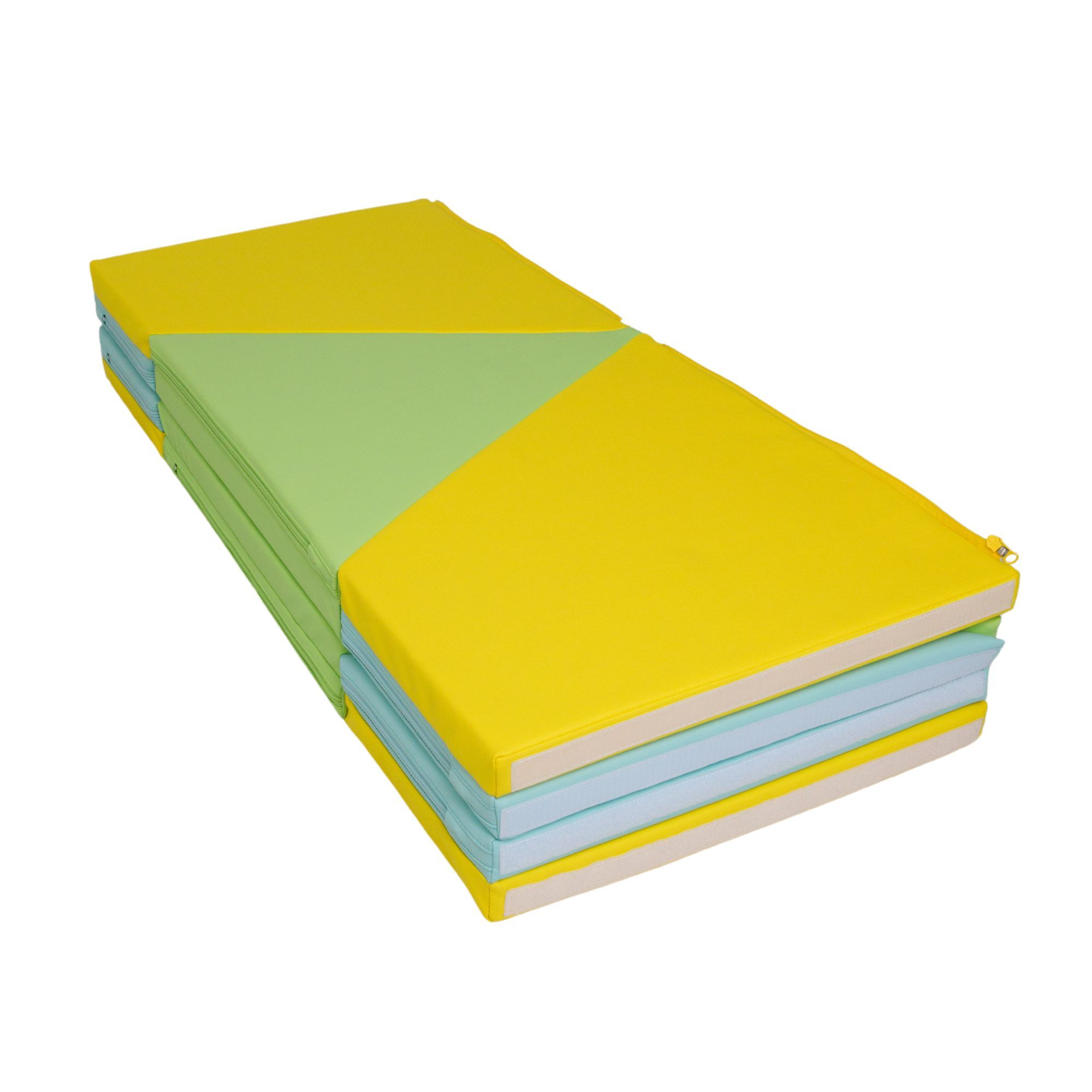 Praktisch: Mit wenigen Handgriffen lässt sich die Spielmatte von 182 x 105 cm auf ein kompaktes Maß von 46 x 105 x 16 cm zusammenfalten – perfekt für platzsparendes Verstauen oder Mitnehmen.