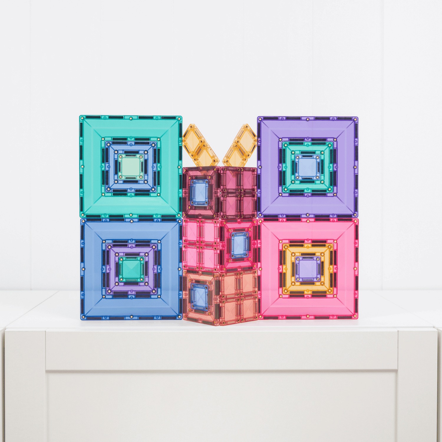 Die verschieden großen quadratischen Portalplatten lassen sich ineinander stapeln und erweitern die klassischen Bauformen. Die kleineren Bausteine verfügen über die innovative Smart-Spin-Technologie, die es den Magneten ermöglicht, sich um bis zu 360° zu drehen. Dadurch entstehen neue Verbindungen und noch komplexere Bauwerke.