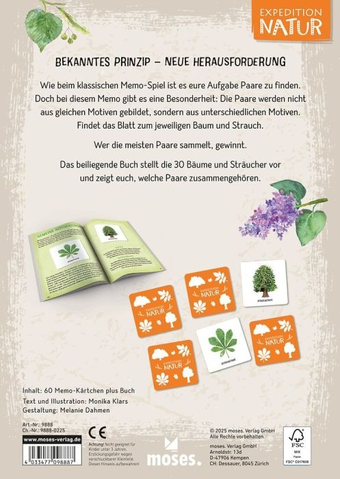 Die Namen der Bäume und Sträucher stehen auf den Kärtchen, sodass Kinder die Paare leichter zuordnen können. Das beiliegende Buch stellt 30 Pflanzenarten vor und zeigt, welche Paare zusammengehören – so wird Gedächtnistraining mit Naturwissen kombiniert.
