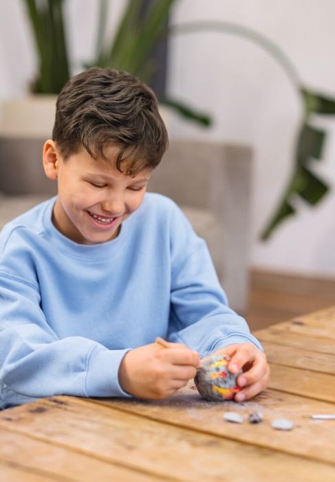 Expedition Natur – Meteoriten Ausgrabungsset Bereit für eine Reise ins All? Mit dem Expedition Natur Meteoriten Ausgrabungsset verwandelt sich jedes Kinderzimmer in eine Weltraum-Mission! Im Inneren eines Gipsblocks warten zwei authentisch wirkende Meteoriten-Repliken darauf, entdeckt zu werden. Mit Pinsel, Holzmeißel und Lupe ausgestattet, graben sich kleine Forscherinnen Schicht für Schicht durch das Material – wie echte Paläontologinnen des Universums. Ein samtiger Beutel dient zur Aufbewahrung der Fundstücke und das beiliegende Booklet vermittelt spannendes Wissen über Meteoriten, ihren Ursprung und ihre Reise durchs All.