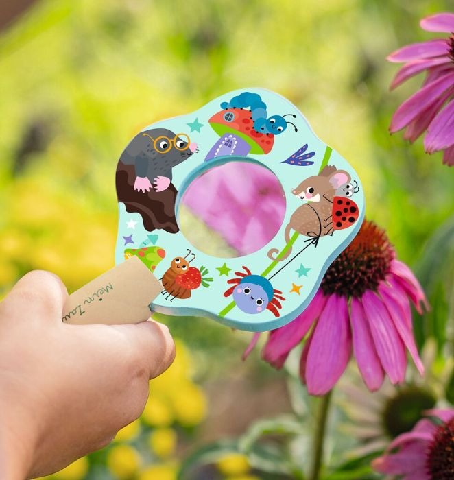 Die handliche Holzlupe liegt perfekt in kleinen Kinderhänden und ist liebevoll mit fröhlichen Illustrationen aus dem Zaubergarten gestaltet. So wird das Forschen, Staunen und Lernen zum spielerischen Erlebnis – ideal für kleine Naturentdecker*innen.