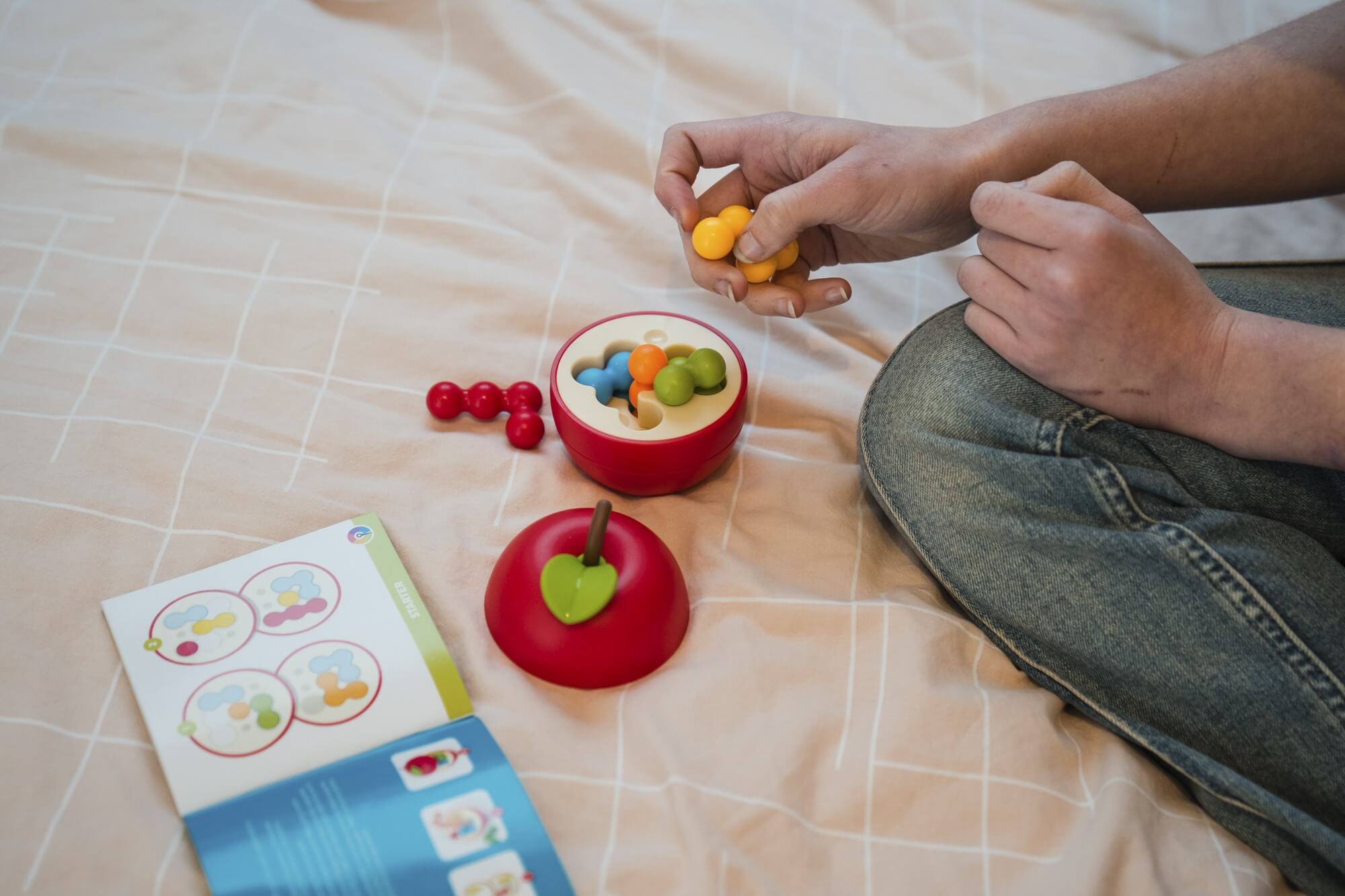 3 Apfelscheiben (1 untere Scheibe, 1 mittlere Scheibe und 1 obere Scheibe), 5 Würmer, 1 Heft mit 80 Herausforderungen und Lösungen.
