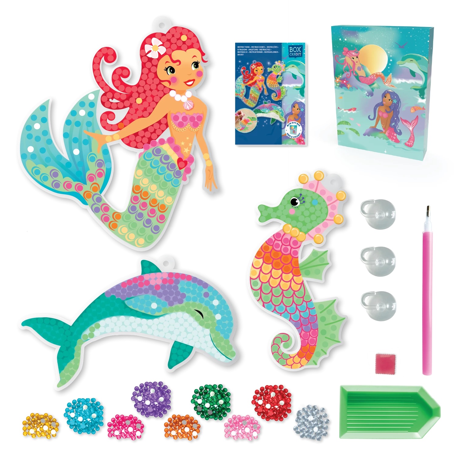 Mit dem Glitzer-Fensterbilder Unterwasserwelt Bastelset von ARTista tauchen Kinder in eine funkelnde Meereswelt ein! Ob Seepferdchen, Delfin oder Meerjungfrau – jedes Motiv ist bereits farbig vorbedruckt und zeigt genau, wo die glitzernden Strasssteine platziert werden.