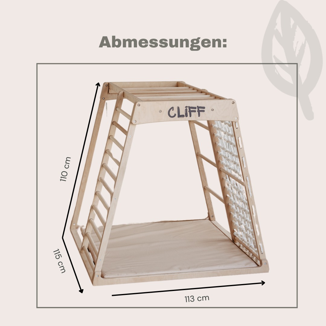 Mit einer Belastbarkeit von bis zu 100 kg, gefertigt nach der EU-Spielzeugsicherheitsrichtlinie 2009/48/EG, und der lebenslangen Garantie steht CLIFF PRO für höchste Sicherheit und Qualität. Das Klettergerüst ist nicht nur ein Spielgerät, sondern auch ein wertvolles Trainingsgerät: Es stärkt die Grob- und Feinmotorik, unterstützt gesunde Fußentwicklung und lädt zu kreativem Spiel ein – ein echtes Highlight im Kinderzimmer.
