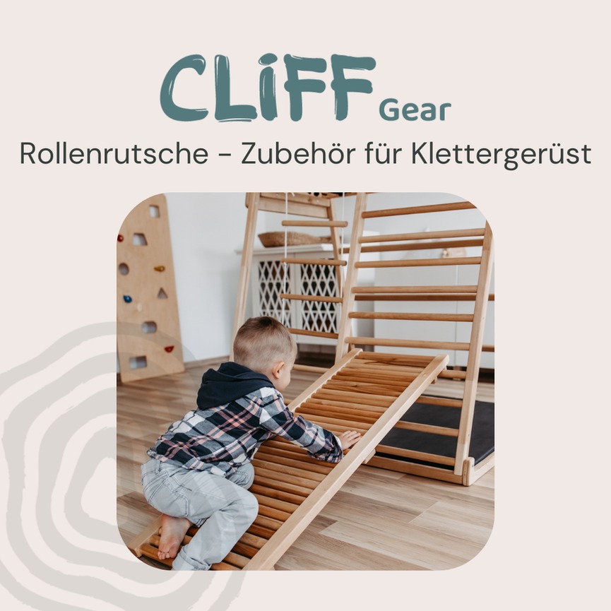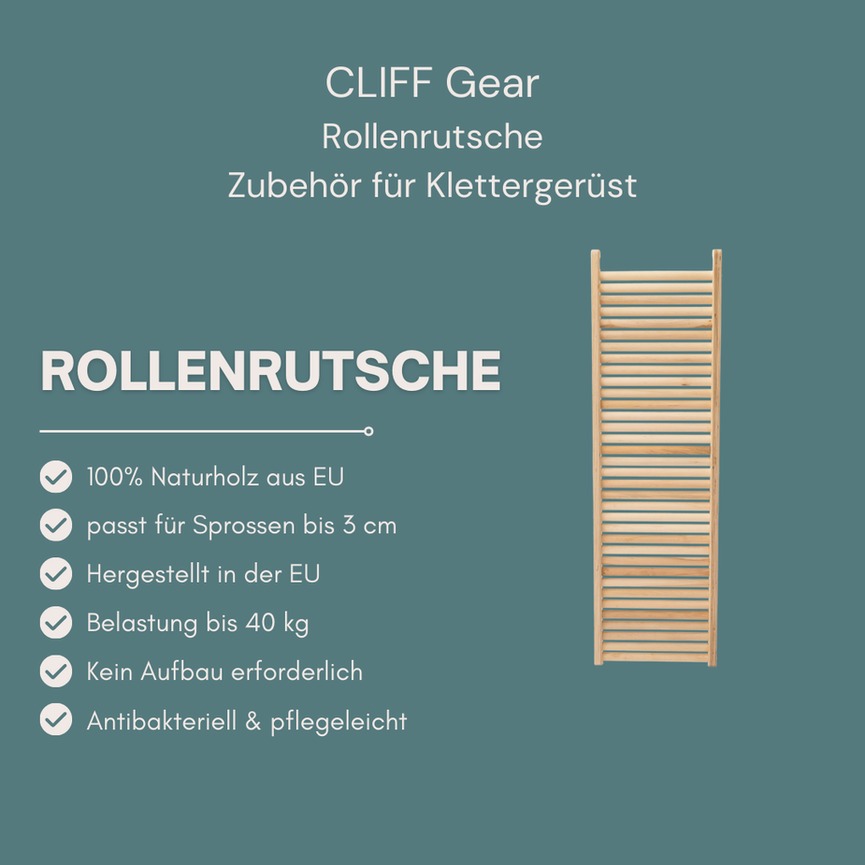 Gefertigt aus hochwertigem Naturholz und in der EU fair und nachhaltig produziert, überzeugt die Rollenrutsche durch Stabilität, Sicherheit und Langlebigkeit. Sie ist kompatibel mit allen Clifff-Klettergerüsten – Pro, Compact, Flex und Combo – und lässt sich im Handumdrehen integrieren.