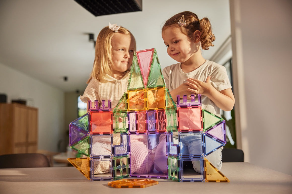 Extra kreativ: Baue an magnetischen Oberflächen wie Heizkörpern oder Tafeln und gestalte vertikale Kunstwerke. Mit abwaschbaren Markern können zusätzlich Zahlen, Buchstaben oder eigene Ideen gezeichnet werden – für noch mehr Spaß und Fantasie!