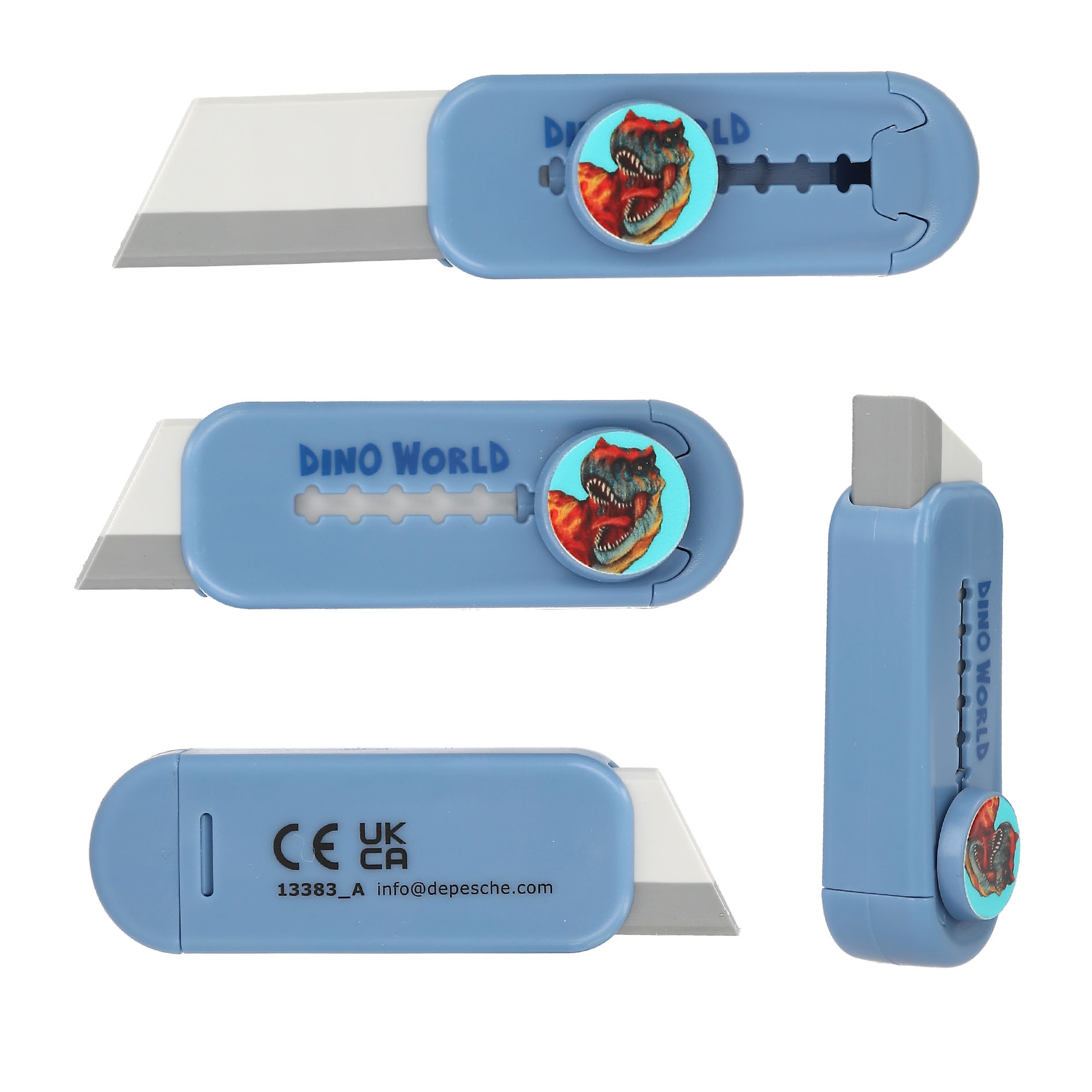 Die Dino World Radierer im Cutter-Messer-Look sind ein echtes Highlight für kleine Dino-Fans. Mit einem Handgriff lässt sich der graue Radierer einfach heraus- und wieder hineinschieben – super praktisch und stylisch zugleich. Die Griffe gibt es in Blau oder Grün, jeweils mit einem coolen runden T-Rex-Print. Perfekt für Schule, Hausaufgaben oder kreative Dino-Abenteuer!