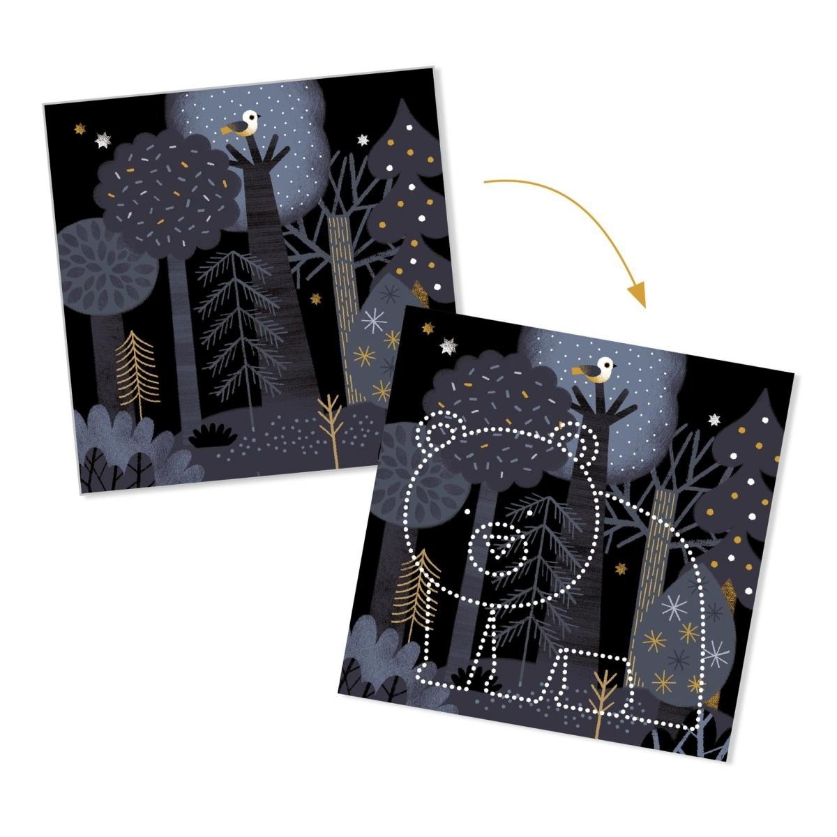 Das Kind wählt einen Untergrund und ein Tiermotiv aus und fixiert beide Blätter auf der Unterlage. Mithilfe eines Werkzeugs folgt es den Punkten auf der Vorlage. Wenn das Bild fertig ist, kann eine Lichtquelle hinter das Bild gestellt werden, um das Tier zum Vorschein zu bringen.
