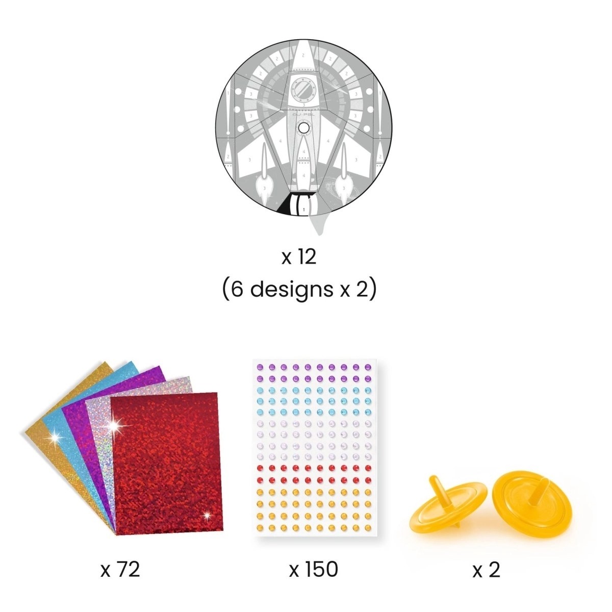 Mit diesem Kreativset zum Thema Weltraum gestalten Kinder ihre eigenen, faszinierenden Drehkreisel mit beeindruckenden Metallic-Effekten. Die 12 Kreisel werden mit glänzender Folie und funkelnden Strasssteinen verziert und sorgen beim Drehen für ein magisches Spiel aus Licht und Farbe – wie ein kleiner Blick ins Universum.