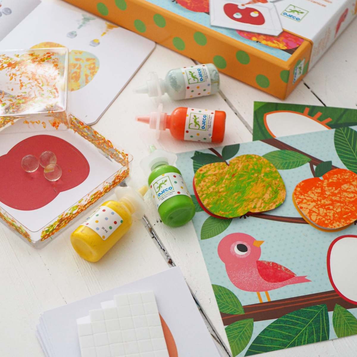 Inhalt: 4 illustrierte Bilder zum Ausmalen, 21 Formen zum Ausmalen, 4 Flaschen Fingerfarben (orange, gelb, wassergrün und apfelgrün), 1 Kunststoffbox mit 3 Glasperlen, doppelseitiges Klebeband und 1 Schritt-für-Schritt-Erklärungsheft.