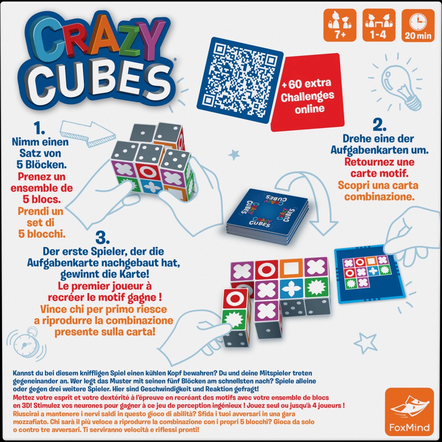 Crazy Cubes ist der blitzschnelle Knobelspaß für die ganze Familie! Ziel ist es, mit den eigenen fünf Würfeln so schnell wie möglich das Muster der aufgedeckten Aufgabenkarte nachzubauen. Sobald eine Karte auf dem Tisch liegt, puzzeln alle Spieler gleichzeitig.