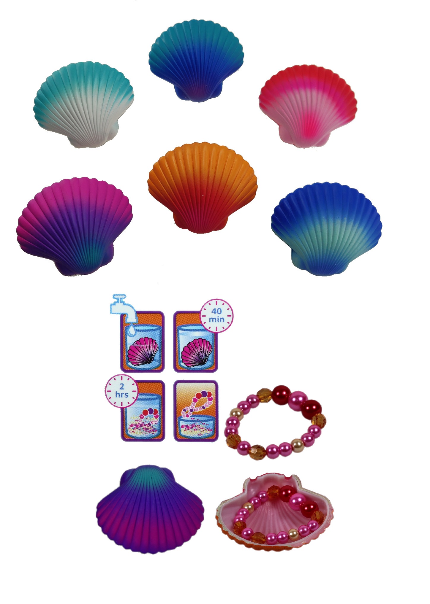 Die Magische Muschel versteckt ein wunderschönes Armband. Lege die Muschel hierfür in ein Glas mit Wasser, nach ca. 2 Stunden löst sich eine Hälfe der Muschel auf und gibt das Armband frei.