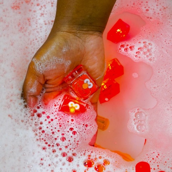 Funkionsweise: Jeder Würfel kann bis zu 16 Stunden lang leuchten, was ungefähr 30 abendlichen Bädern entspricht. Das Licht wird nur aktiviert, wenn der Würfel mit Wasser in Kontakt kommt. Sobald er aus dem Wasser genommen wird, schaltet sich der Würfel automatisch aus. Jeder Würfel ist mit einer nicht austauschbaren Knopfbatterie ausgestattet.
