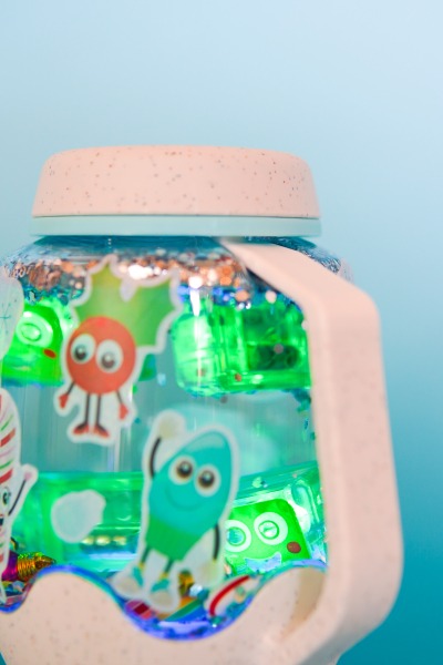 Sensorisches Spielglas: Inhalte und Flüssigkeit nach dem Spielen entfernen. Nur von Hand mit Wasser und Seife reinigen. Batterie-Fach trocken halten, nicht ins Wasser tauchen. Zum Ausschalten das Glas einfach umdrehen.