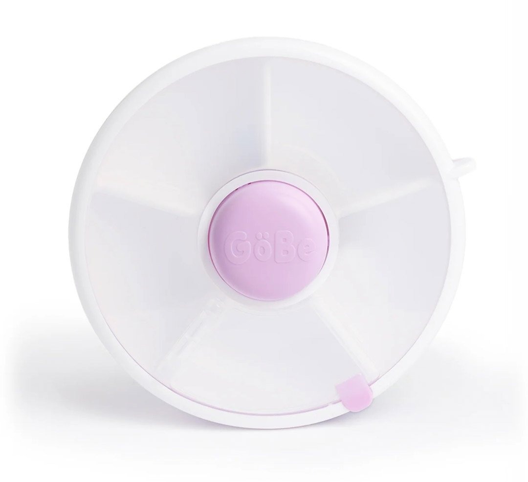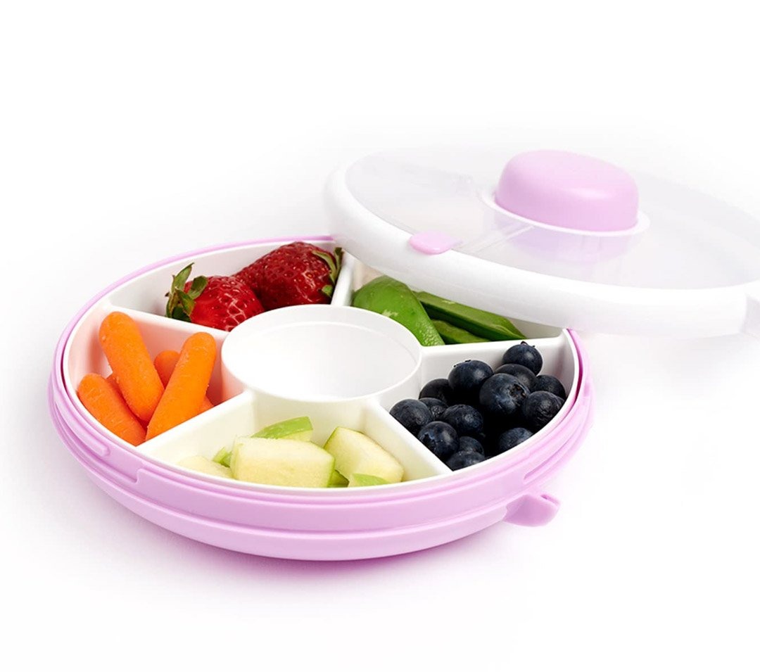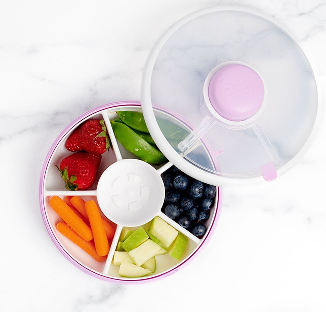 Der GoBe Snack Spinner s macht aus jeder Snackpause ein kleines Erlebnis. Durch Drücken des Knopfes in der Mitte dreht sich der innere Teller und bringt eines der fünf Fächer zum Vorschein – ideal, um Obst, Gemüse, Nüsse oder ein halbes Sandwich getrennt und übersichtlich aufzubewahren. Dank des transparenten Deckels behält man den Überblick, und der Drehmechanismus sorgt ganz nebenbei für spielerischen Lernspaß, zum Beispiel beim Zählen.